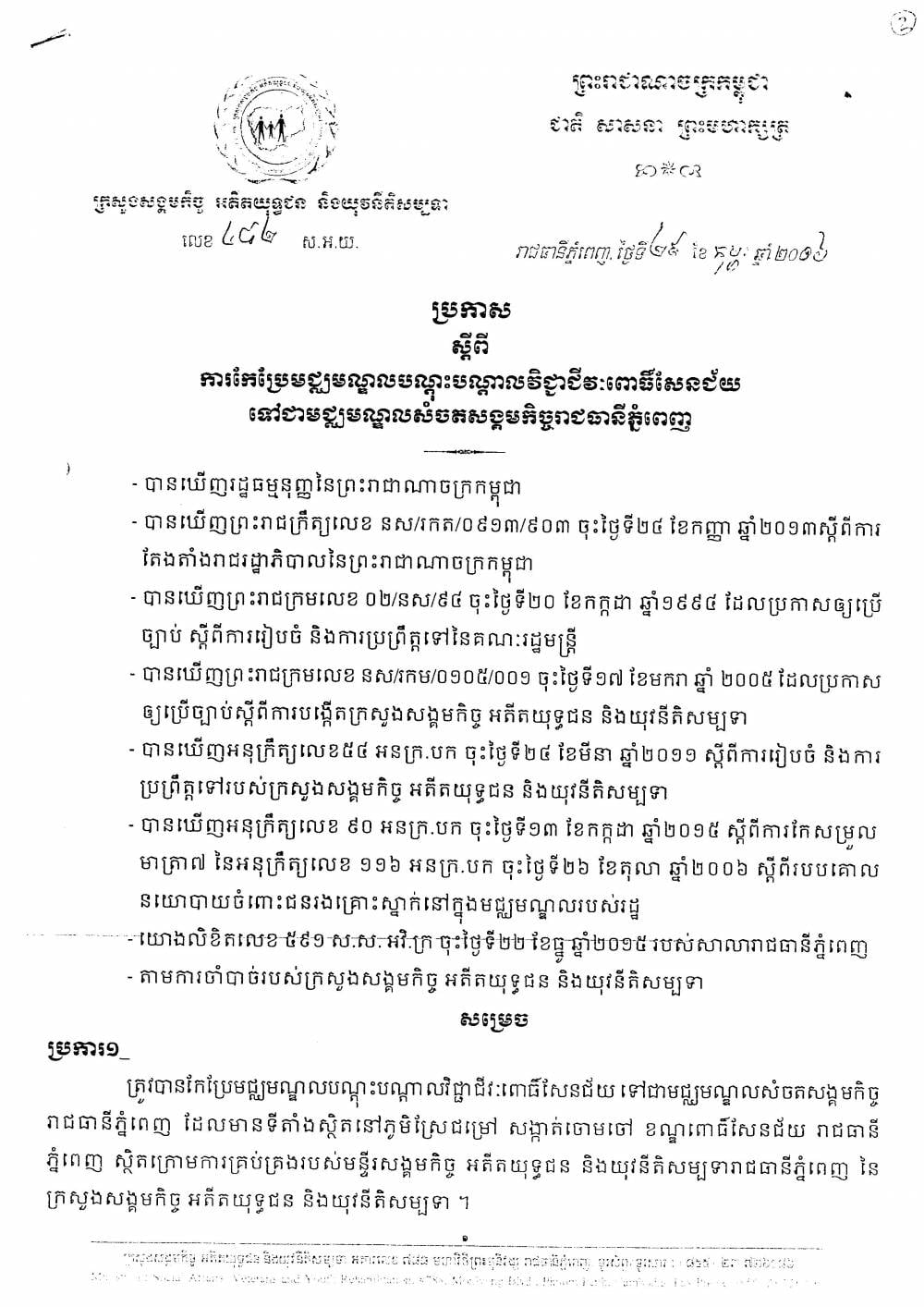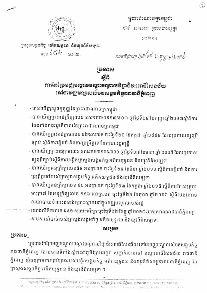 ប្រកាសស្តីពីការកែប្រែមជ្ឈមណ្ឌលបណ្តុះបណ្តាលវិជ្ជាជីវៈពៅធិ៍សែនជ័យទៅជាមជ្ឈមណ្ឌលសំចតសង្គមកិច្ចរាជធានីភ្នំពេញ