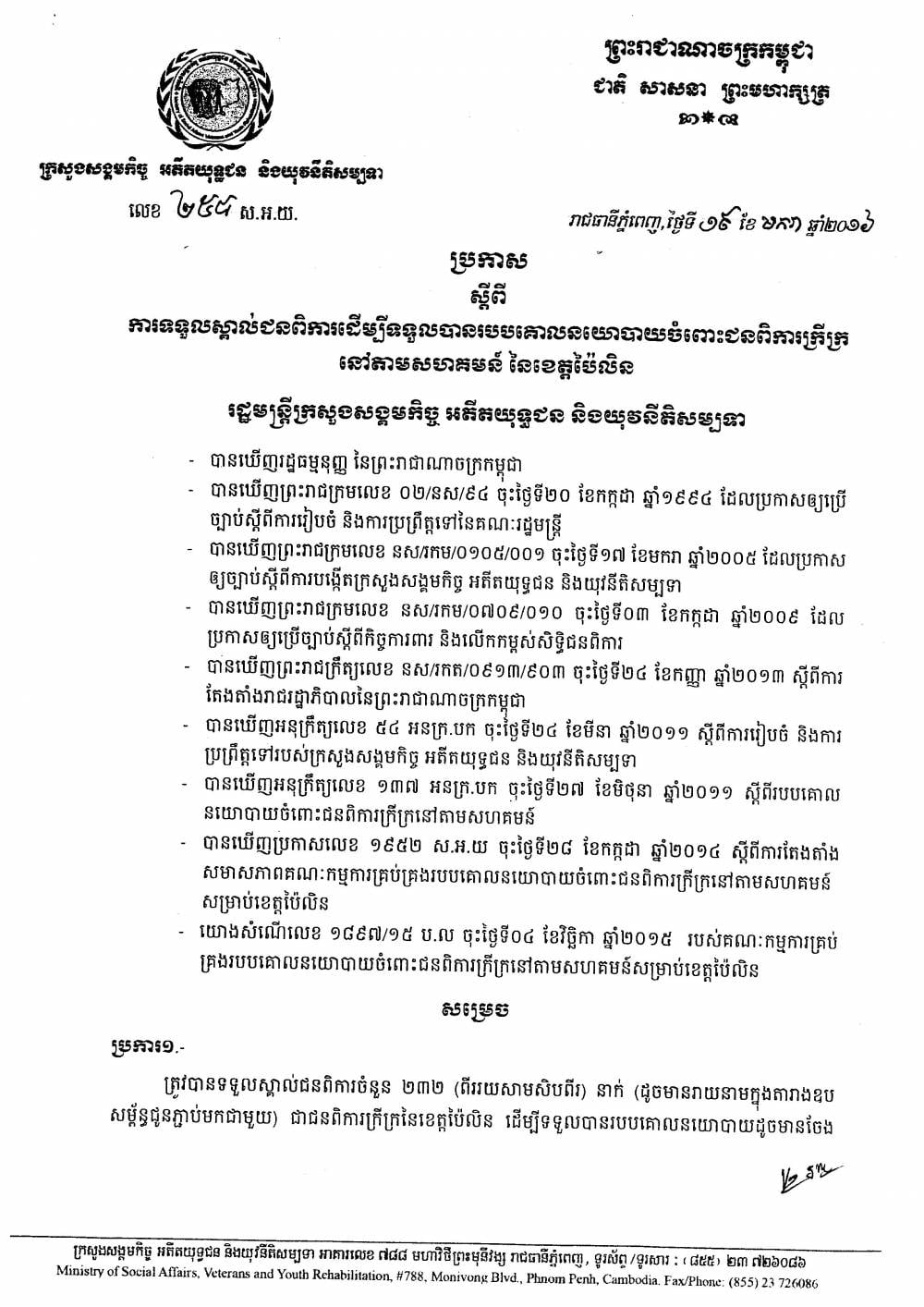 ប្រកាសស្តីពីការទទួលស្គាល់ជនពិការដើម្បីទទួលបានរបបគោលនយោបាយចំពោះជនពិការក្រីក្រនៅតាមសហគមន៍ នៃខេត្តប៉ៃលិន