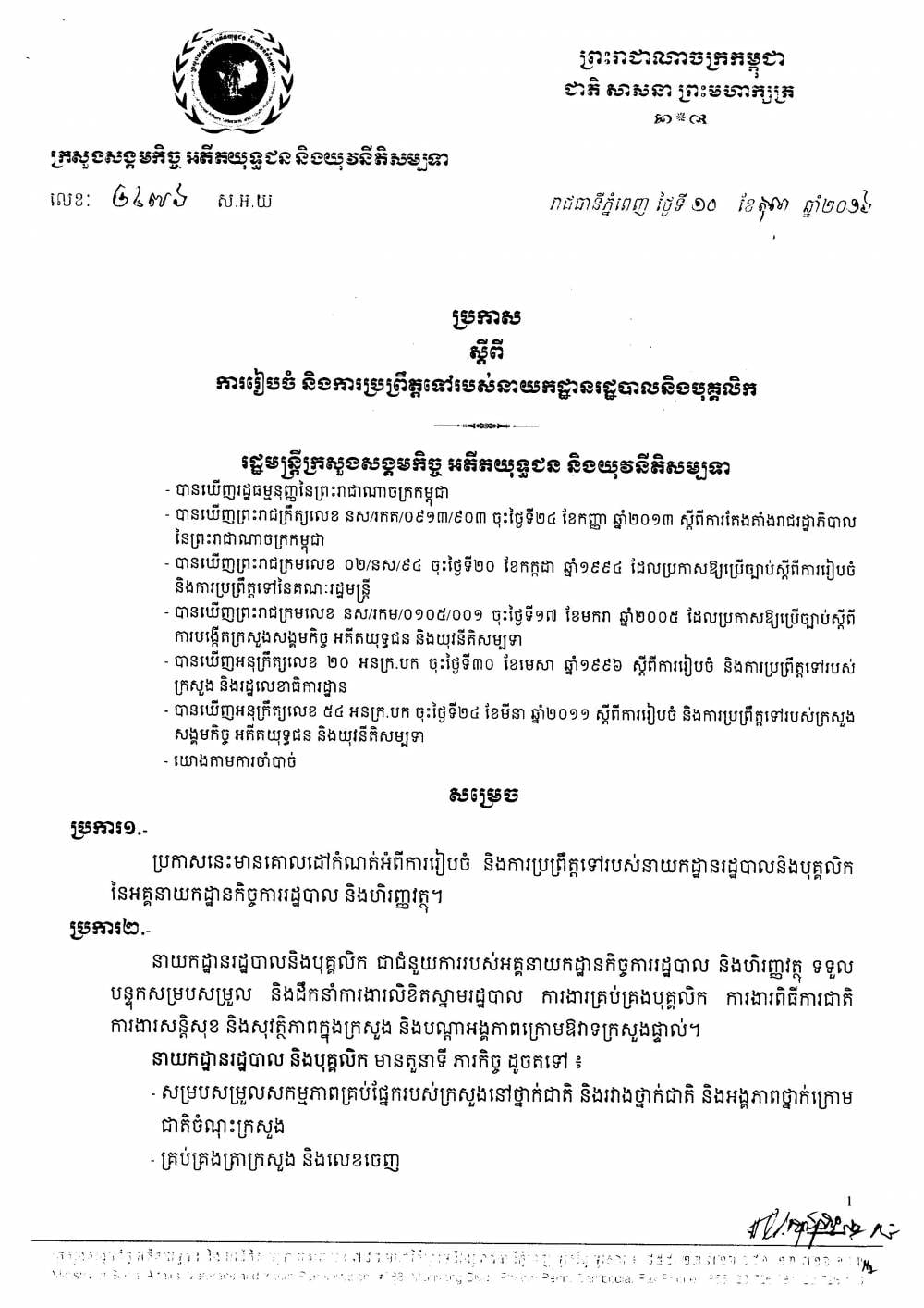 ប្រកាសស្តីពីការរៀបចំ និងការប្រព្រឹត្តទៅរបស់នាយកដ្ឋានរដ្ឋបាលនិងបុគ្គលិក