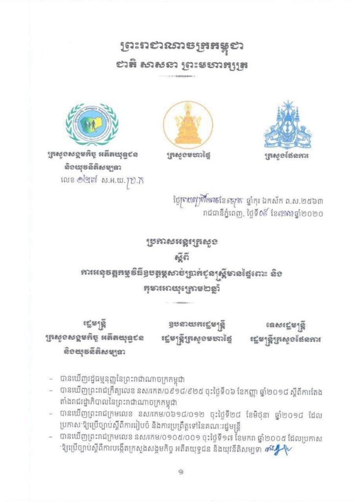 • ប្រកាស ស្តីពីការរៀបចំ និងការប្រព្រឹត្តទៅរបស់មន្ទីរសង្គមកិច្ច អតីតយុទ្ធជន និងយុវនីតិសម្បទារាជធានី ខេត្ត