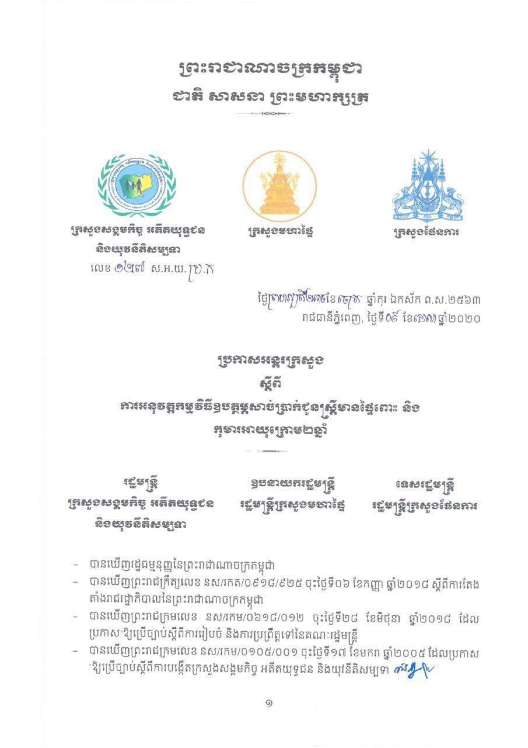 ប្រកាសអន្តរក្រសួង ស្តីពីការអនុវត្តកម្មវិធីឧបត្ថម្ភសាច់ប្រាក់ជូនស្រ្តីមានផ្ទៃពោះ និងកុមារអាយុក្រោម២ឆ្នាំ
