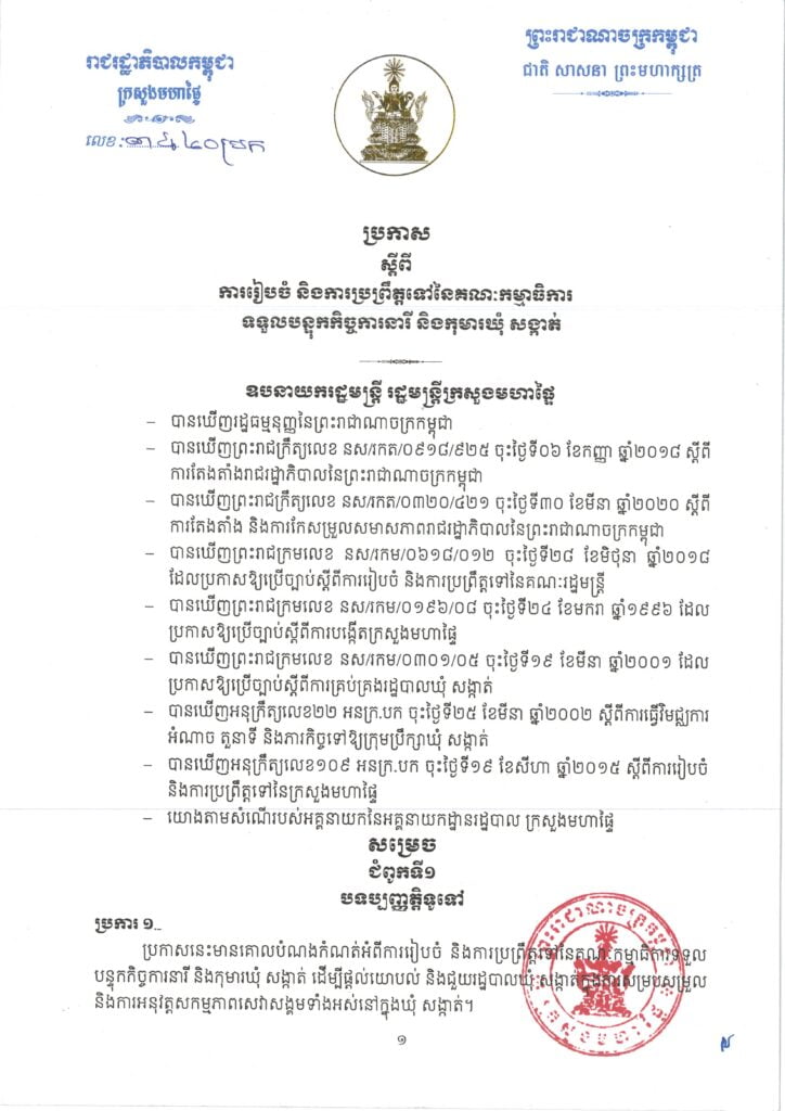 ប្រកាស ស្តីពីការរៀបចំ និងការប្រព្រឹត្តទៅនៃគណៈកម្មាធិការទទួលបន្ទុកកិច្ចការនារី និងកុមារ ឃុំសង្កាត់