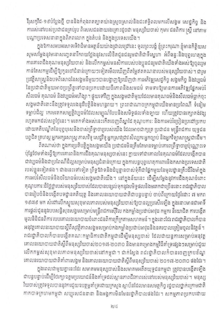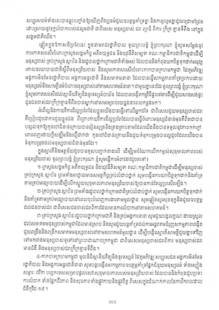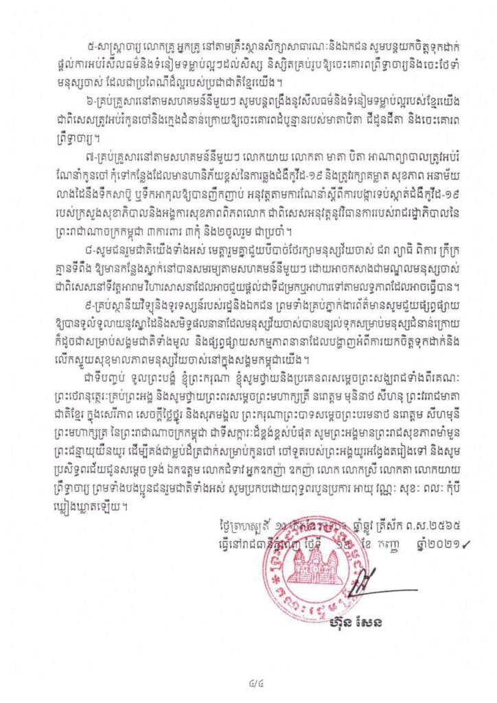 សារលិខិតសម្ដេចអគ្គមហាសេនាបតីតេជោហ៊ុនសែននាយករដ្ឋមន្ត្រីនៃព្រះព្រះរាជជាណាចក្រកម្ពុជាក្នុងឱកាសទិវាមនុស្សចាស់កម្ពុជានិងទិវាមនុស្សចាស់អន្តរជាតិថ្ងៃទី1 ខែតុលាឆ្នាំ 2021