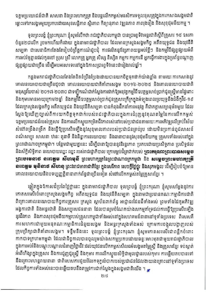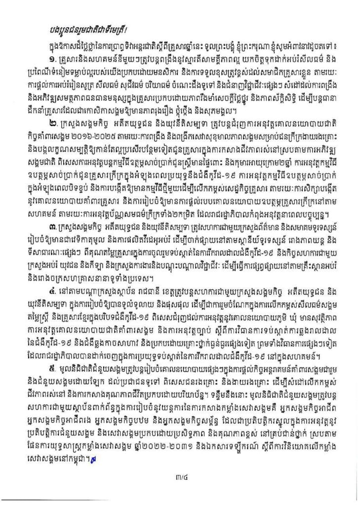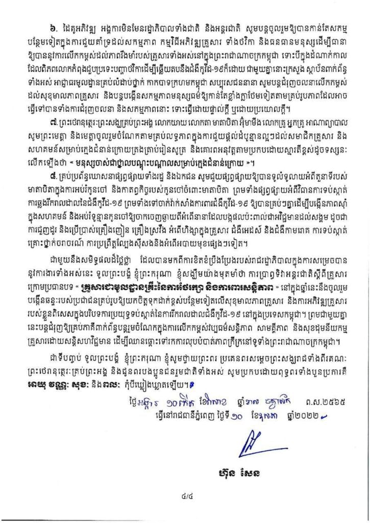 សារលិខិតសម្តេចអគ្គមហាសេនាបតីតេជោ ហ៊ុន សែន នាយករដ្ឋមន្រ្តីនៃព្រះរាជាណាចក្រកម្ពុជា ក្នុងឱកាសទិវាអន្តជាតិស្តីពីគ្រួសារថ្ងៃទី១៥ ខែឧសភា ឆ្នាំ២០២២