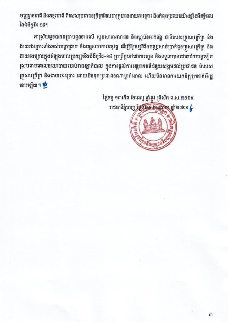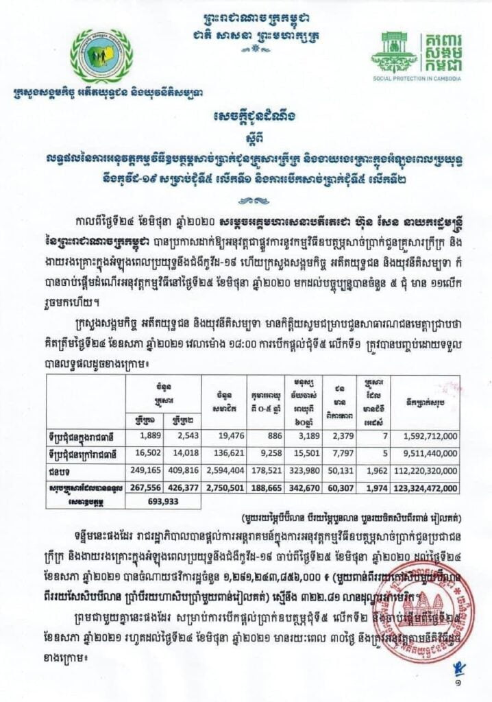 ក្រសួងសង្គមកិច្ច អតីតយុទ្ធជន និងយុវនីតិសម្បទា សូមជូនដំណឹង ស្តីពីលទ្ធផលនៃការអនុវត្តកម្មវិធីឧបត្ថម្ភសាច់ ប្រាក់ជូនគ្រួសារក្រីក្រ និងងាយរងគ្រោះក្នុងអំឡុងពេលប្រយុ ទ្ធនឹងកូវីដ-១៩ សម្រាប់ជុំទី៥ លើកទី១ ដែលបានអនុវត្តចាប់ ពីថ្ងៃទី២៥ ខែមេសា ដល់២៤ ខែឧសភា ឆ្នាំ២០២១ និងការបើកសាច់ប្រាក់ជុំទី៥ លើកទី២ ដែលចាប់ផ្តើមអនុវត្តចាប់ពីថ្ងៃទី ២៥ ខែឧសភា ដល់២៤ ខែមិថុនា ឆ្នាំ២០២១។