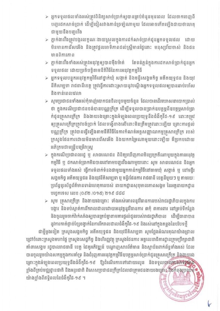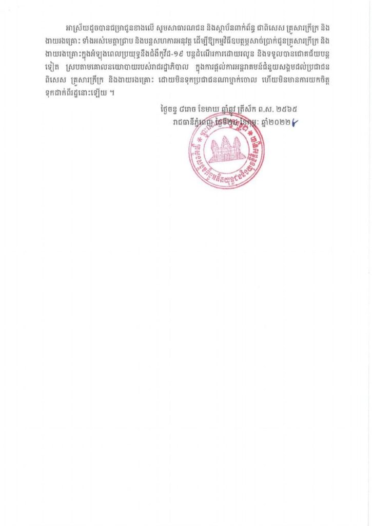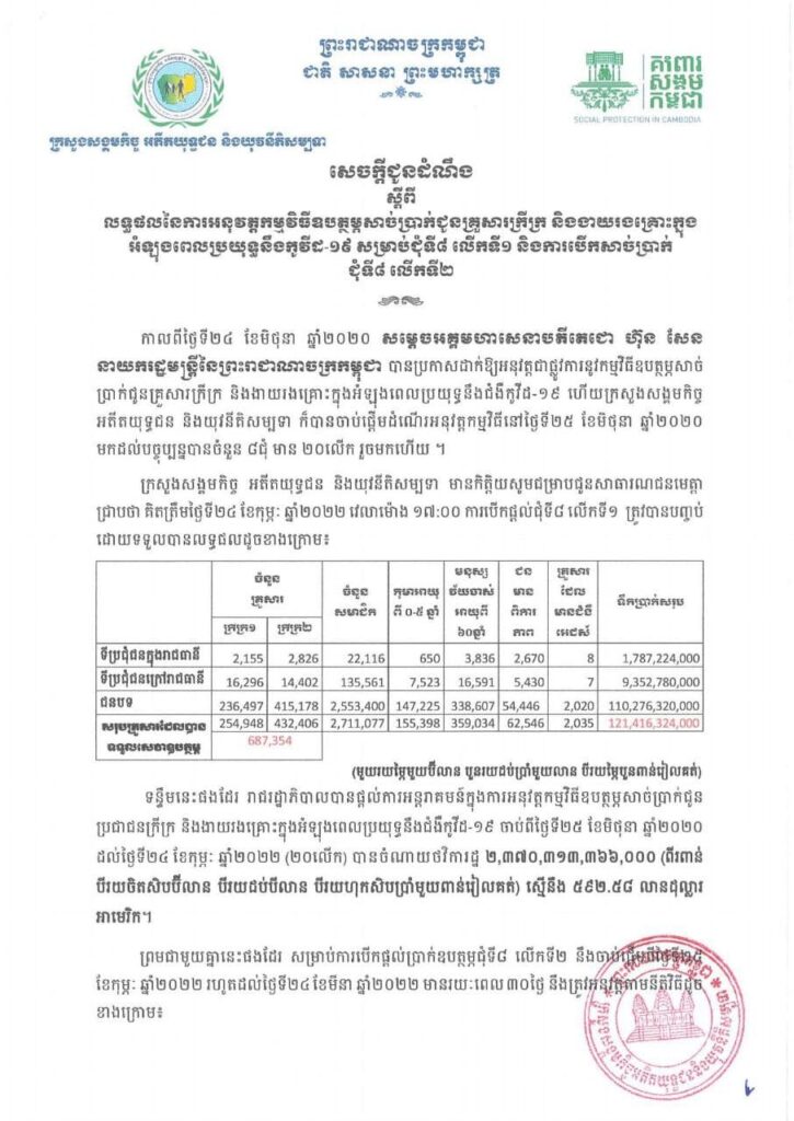 សង្គមកិច្ច៖ ថ្ងៃទី២៥ ខែកុម្ភៈ ឆ្នាំ២០២២ ក្រសួងសង្គមកិច្ច អតីតយុទ្ធជន និងយុវនីតិសម្បទា បានចេញសេចក្តីជូនដំណឹង ស្តីពីលទ្ធផលនៃការអនុវត្តការបើកសាច់ប្រាក់ពីកម្មវិធីឧបត្ថម្ភសាច់ប្រាក់ជូនគ្រួសារក្រីក្រ និងងាយរងគ្រោះអំឡុងពេលប្រយុទ្ធនឹងកូវីដ១៩ ជុំទី៨ លើកទី១ និងការបន្តបើកសម្រាប់ជុំទី៨ លើកទី២ ដែលបានអនុវត្តចាប់ពីថ្ងៃទី២៥ ខែកុម្ភៈ ឆ្នាំ២០២២ ដល់ថ្ងៃទី២៤ ខែមីនា ឆ្នាំ ២០២២ មានរយៈពេល ៣០ថ្ងៃ។