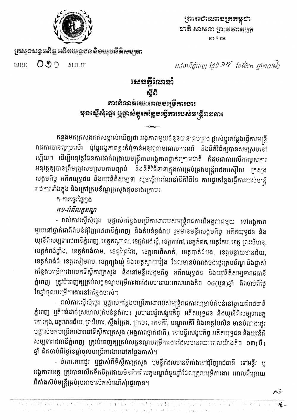 សេចក្តីណែនាំស្តីពីការកំណត់រយៈពេលបម្រើការងារមុនស្នើសុំផ្ទេរ ឬផ្លាស់ប្តូរកន្លែងធ្វើការរបស់មន្ត្រីរាជការ