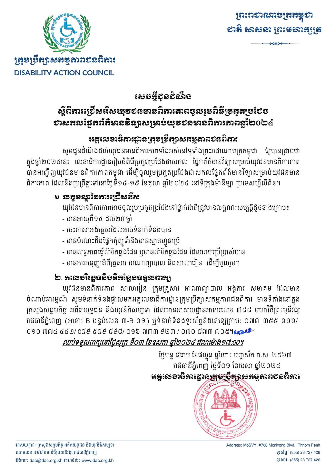 រាជធានីភ្នំពេញ ៖ អគ្គលេខាធិការដ្ឋានក្រុមប្រឹក្សាសកម្មភាពជនពិការ សូមជូនដំណឹងដល់យុវជនមានពិការភាពទាំងអស់ទូទាំងព្រះរាជាណាចក្រកម្ពុជា ឱ្យបានជ្រាបថាក្នុងឆ្នាំ២០២៤នេះ លេខាធិការដ្ឋានរៀបចំពិធីប្រកួតប្រជែងជាសកល ផ្នែកព័ត៌មានវិទ្យាសម្រាប់យុវជនមានពិការភាព បានអញ្ជើញយុវជនមានពិការភាពកម្ពុជា ដើម្បីចូលរួមប្រកួតប្រជែងជាសកលផ្នែកព័ត៌មានវិទ្យាសម្រាប់យុវជនមានពិការភាព ដែលនឹងប្រព្រឹត្តទៅនៅថ្ងៃទី១៤-១៩ ខែតុលា ឆ្នាំ២០២៤ នៅទីក្រុងម៉ានីឡាប្រទេសហ្វីលីពីន។