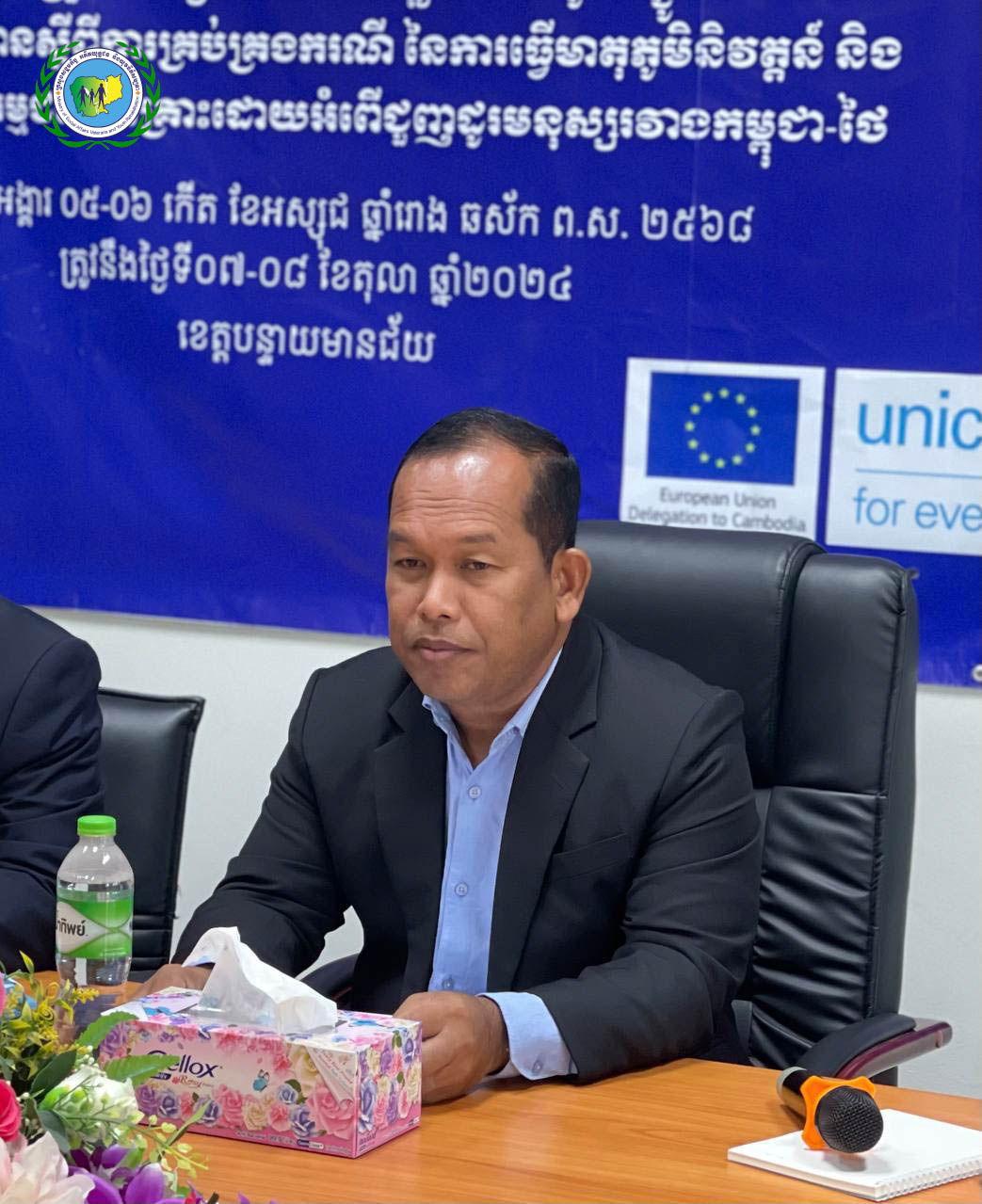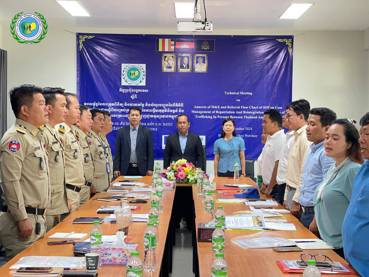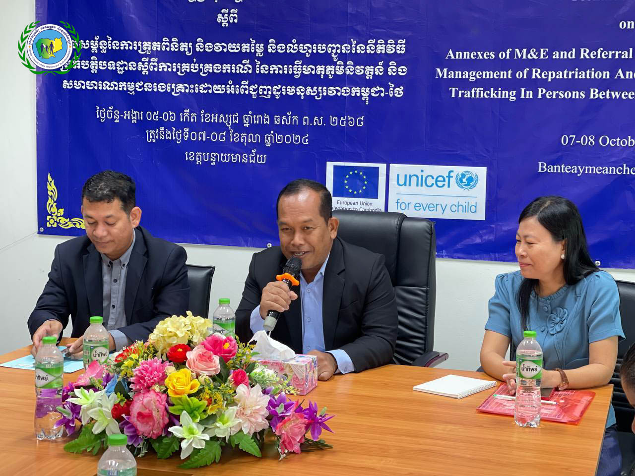 ខេត្ត បន្ទាយមានជ័យ ៖នៅព្រឹកថ្ងៃចន្ទ ៥ កើត ខែអស្សុជ ឆ្នាំរោង ឆស័ក ពុទ្ធសករាជ ២៥៦៨ ត្រូវនឹងថ្ងៃទី៧ ខែតុលា ឆ្នាំ២០២៤ ឯកឧត្ដម ឌីន បូរី អគ្គនាយកនៃអគ្គនាយកដ្ឋានសេវាសង្គមកិច្ច បានអញ្ជើញជាអធិបតីក្នុងពិធីបើកកិច្ចប្រជុំបចេ្ចកទេសស្ដីពី ឧបសម្ព័ន្ធនៃការត្រួតពិនិត្យ និងវាយតម្លៃ និងលំហូរបញ្ជូននៃនីតិវិធីប្រតិបត្តិបទដ្ឋានស្ដីពីការគ្រប់គ្រងករណី នៃការធ្វើមាតុភូមិនិវត្តន៍ និងសមាហរណកម្មជនរងគ្រោះដោយអំពើជួញដូរមនុស្សរវាងកម្ពុជា-ថៃ ដោយមានការអញ្ជើញចូលរួមពី លោក ប្រធាន អនុប្រធាននាយកដ្ឋានគាំពារជនរងគ្រោះ មន្ត្រីអន្តោប្រវេសន៍ ច្រកទ្វារអន្តរជាតិប៉ោយប៉ែត មន្ត្រីនៃមជ្ឈមណ្ឌលសំចតប៉ោយប៉ែត និងអង្គការដៃគូរ។
