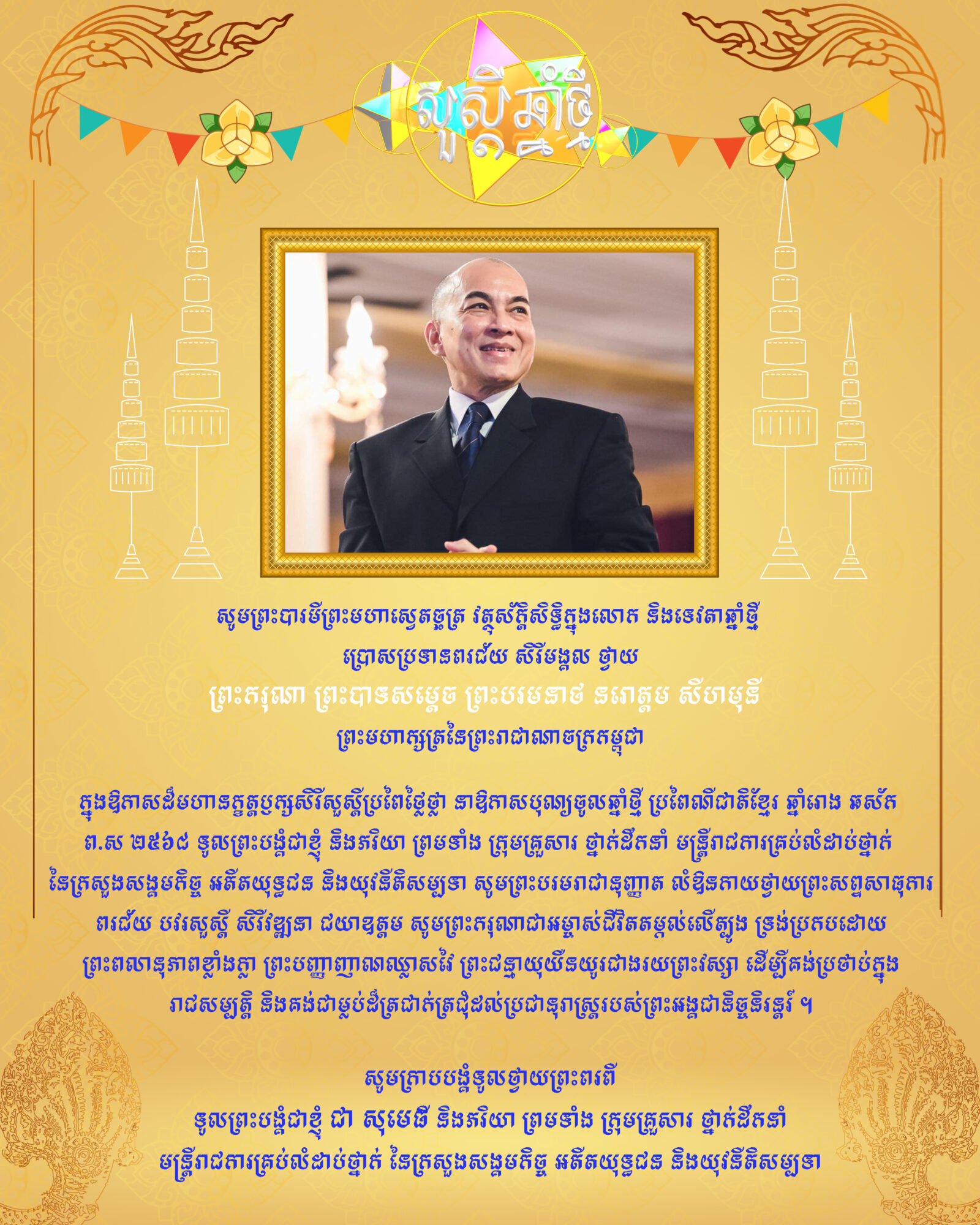 ឯកឧត្តមរដ្ឋមន្រ្តី ជា សុមេធី ផ្ញើរសារលិខិតថ្វាយព្រះពរ ក្រាបបង្គំទូលថ្វាយ ព្រះករុណាព្រះបាទសម្តេចព្រះបរមនាថ នរោត្តម សីហមុនី ព្រះមហាក្សត្រ នៃព្រះរាជាណាចក្រកម្ពុជា ជាទីគោរពសក្ការៈដ៏ខ្ពង់ខ្ពស់បំផុត ក្នុងឱកាសចូលឆ្នាំថ្មី ប្រពៃណីជាតិខ្មែរ ឆ្នាំរោង ឆស័ក ព.ស ២៥៦៨ ត្រូវនឹងថ្ងៃទី១៣ ខែមេសា ឆ្នាំ២០២៤ ខាងមុខនេះ។