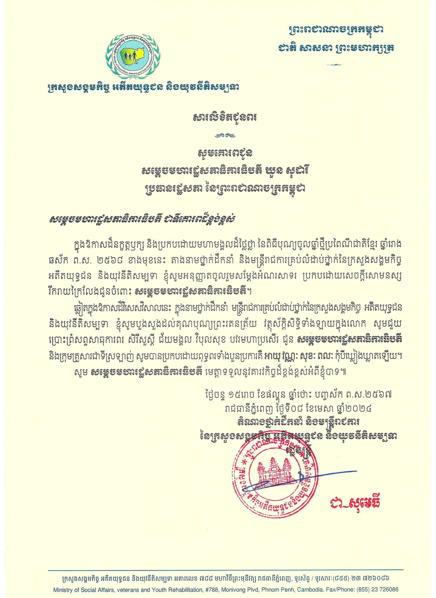 ឯកឧត្តមរដ្ឋមន្ត្រី ជា សុមេធី ផ្ញើរសារលិខិតជូនពរ សូមគោរពជូន សម្ដេចមហារដ្ឋសភាធិការធិបតី ឃួន សុដារី ប្រធានរដ្ឋសភា នៃព្រះរាជាណាចក្រកម្ពុជា ជាទីគោរពដ៏ខ្ពង់ខ្ពស់បំផុត ក្នុងឱកាសចូលឆ្នាំថ្មី ប្រពៃណីជាតិខ្មែរ ឆ្នាំរោង ឆស័ក ព.ស ២៥៦៨ ត្រូវនឹងថ្ងៃទី១៣ ខែមេសា ឆ្នាំ២០២៤ ខាងមុខនេះ។