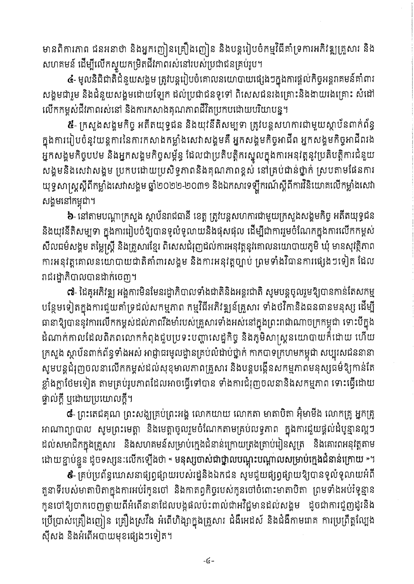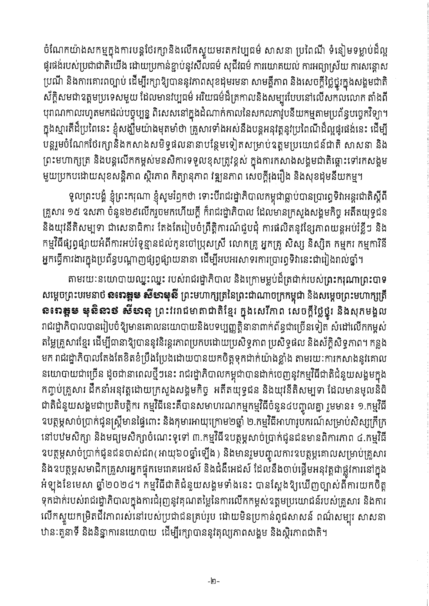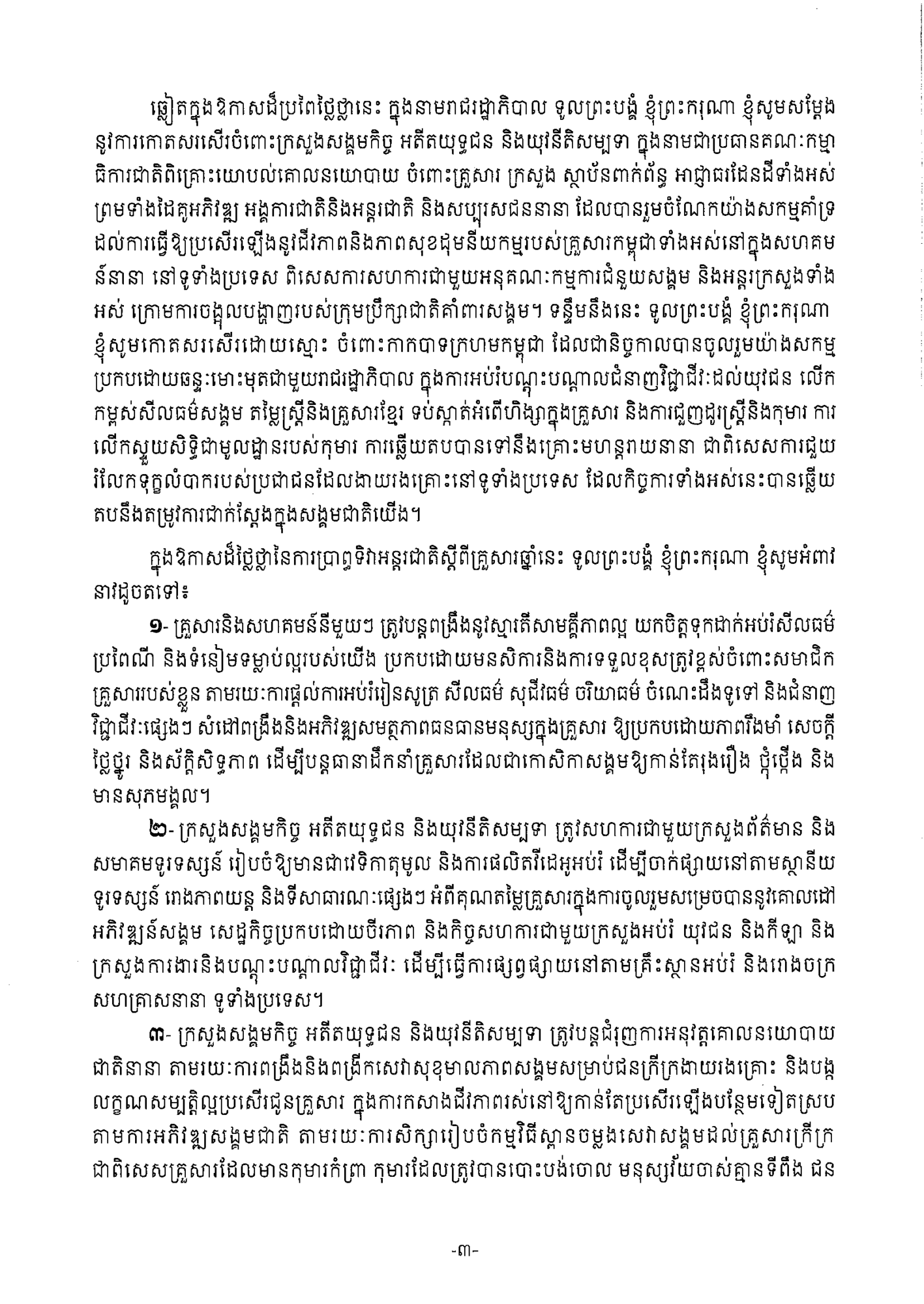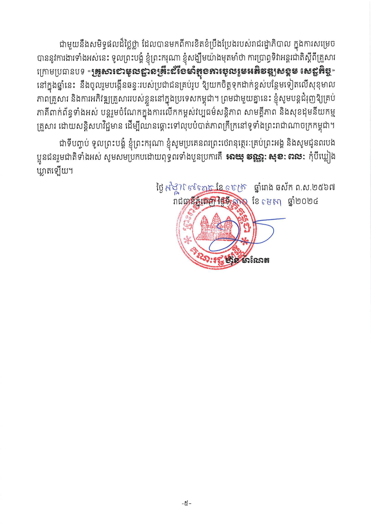 សារលិខិត សម្ដេចមហាបវរធិបតី ហ៊ុន ម៉ាណែត នាយករដ្ឋមន្រ្តី នៃព្រះរាជាណាចក្រកម្ពុជា ក្នុងឱកាសទិវាអន្តរជាតិស្ដីពីគ្រួសារ ថ្ងៃទី១៥ ខែឧសភា ឆ្នាំ២០២៤។