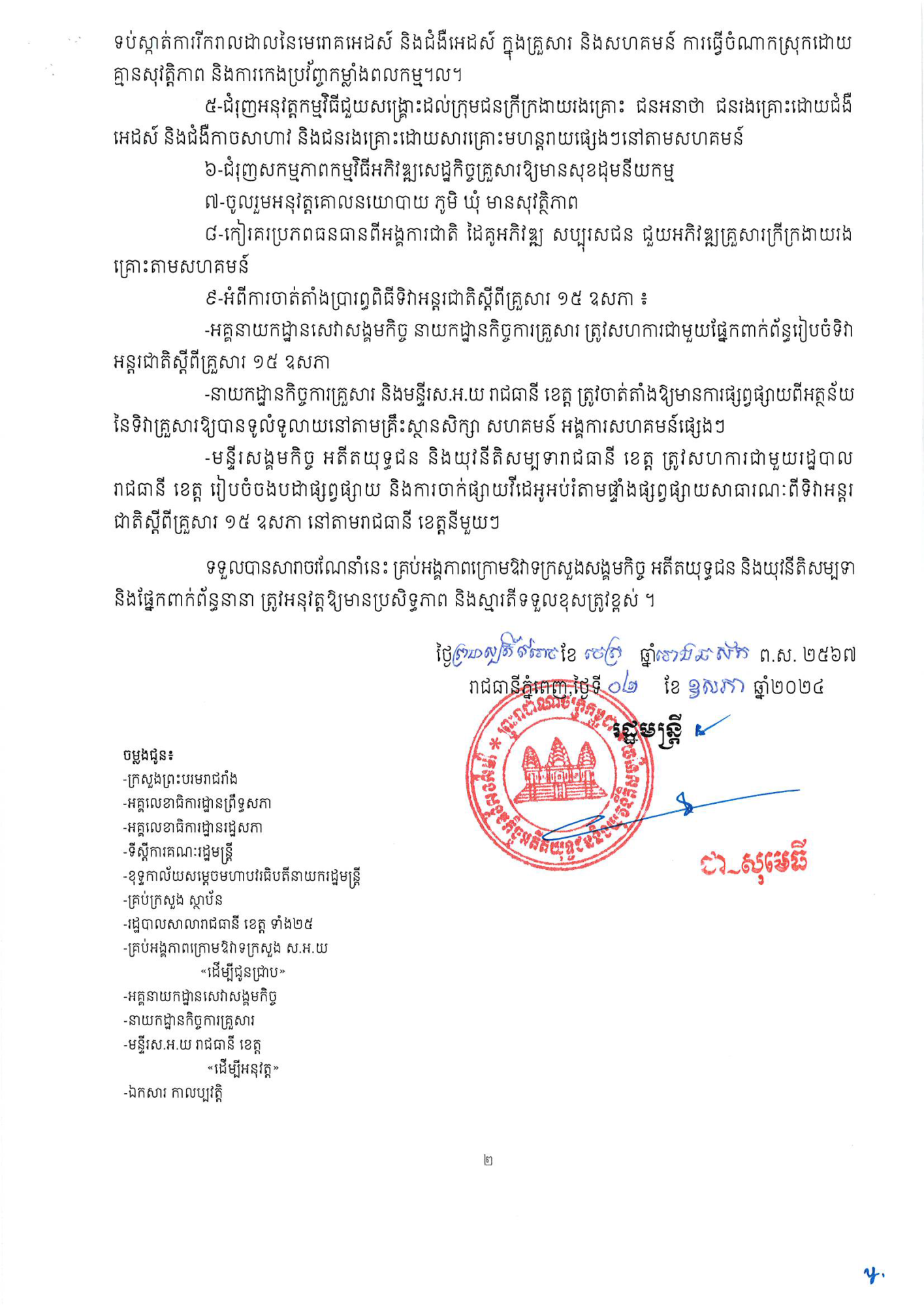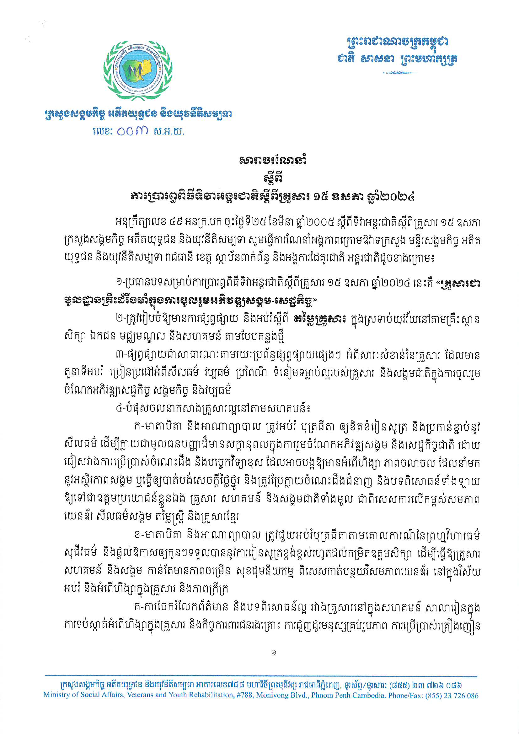 សារាចរណែនាំរបស់ ក្រសួងសង្គមកិច្ច អតីតយុទ្ធជន និងយុវនីតិសម្បទា ស្ដីពីការប្រារព្ធពិធីទិវាអន្តរជាតិស្ដីពីគ្រួសារ ថ្ងៃទី១៥ ខែឧសភា ឆ្នាំ២០២៤