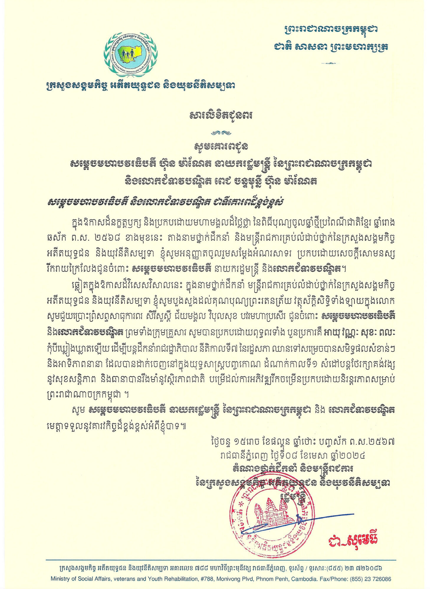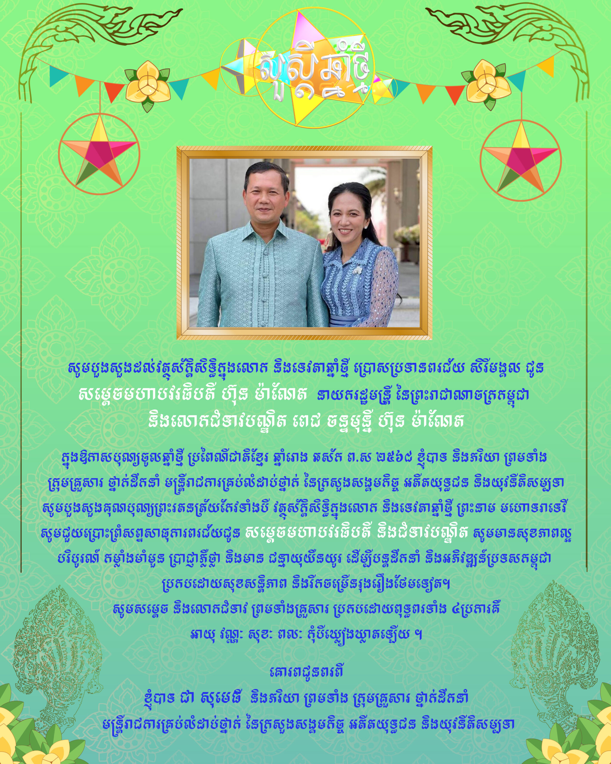 ឯកឧត្តម ជា សុមេធី ផ្ញើរសារលិខិតជូនពរ សូមគោរពជូន សម្តេចមហាបវរធិបតី ហ៊ុន ម៉ាណែត នាយករដ្ឋមន្រ្តី នៃព្រះរាជាណាចក្រកម្ពុជា និងលោកជំទាវបណ្ឌិត ពេជ ចន្ទមុន្នី ហ៊ុន ម៉ាណែត ជាទីគោរពដ៏ខ្ពង់ខ្ពស់បំផុត ក្នុងឱកាសចូលឆ្នាំថ្មី ប្រពៃណីជាតិខ្មែរ ឆ្នាំរោង ឆស័ក ព.ស ២៥៦៨ ត្រូវនឹងថ្ងៃទី១៣ ខែមេសា ឆ្នាំ២០២៤ ខាងមុខនេះ។