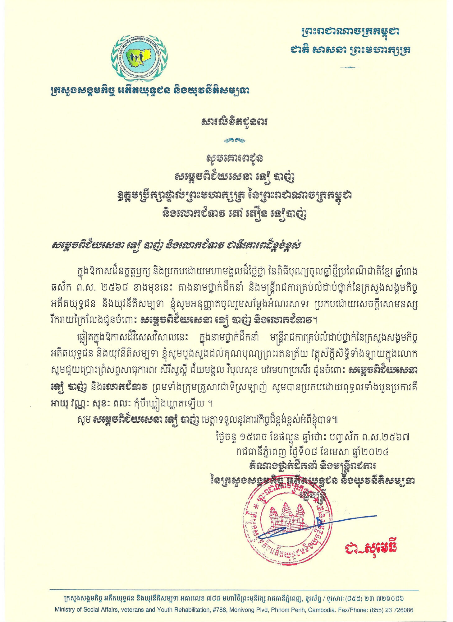 ឯកឧត្តមរដ្ឋមន្រ្តី ជា សុមេធី ផ្ញើរសារលិខិតជូនពរ សូមគោរពជូន សម្ដេចពិជ័យសេនា ទៀ បាញ់ ឧត្តមប្រឹក្សាផ្ទាល់ព្រះមហាក្សត្រ នៃព្រះរាជាណាចក្រកម្ពុជា និងលោកជំទាវ តៅ តឿន ទៀ បាញ់ ជាទីគោរពដ៏ខ្ពង់ខ្ពស់បំផុត ក្នុងឱកាសចូលឆ្នាំថ្មី ប្រពៃណីជាតិខ្មែរ ឆ្នាំរោង ឆស័ក ព.ស ២៥៦៨ ត្រូវនឹងថ្ងៃទី១៣ ខែមេសា ឆ្នាំ២០២៤ ខាងមុខនេះ។
