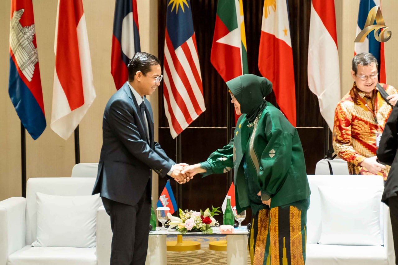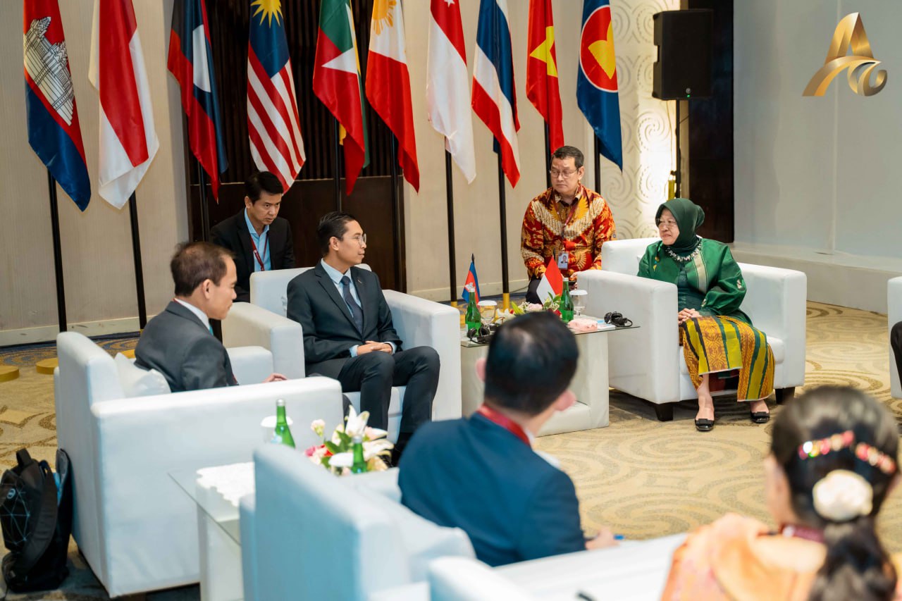 ឥណ្ឌូនេស៊ី៖ នៅសៀលថ្ងៃពុធ ទី១១ ខែតុលា ឆ្នាំ២០២៣ តំណាងដ៏ខ្ពង់ខ្ពស់ឯកឧត្តម ជា សុមេធី រដ្ឋមន្ត្រីក្រសួងសង្គមកិច្ច អតីតយុទ្ធជន និងយុវនីតិសម្បទា ឯកឧត្តម ឯម ច័ន្ទមករា រដ្ឋលេខាធិការ និងជាអគ្គលេខាធិការក្រុមប្រឹក្សាសកម្មភាពជនពិការ បានជួបពិភាក្សាការងារទ្វេភាគីជាមួយលោកជំទាវ ទ្រី រីសមហារីនី រដ្ឋមន្ត្រីក្រសួងសង្គមកិច្ចនៃសាធារណៈរដ្ឋឥណ្ឌូនេស៊ី នៅសណ្ឋាគារសេរ៉ាថោន ទីក្រុងម៉ាកាសា សាធារណៈរដ្ឋឥណ្ឌូនេស៊ី។