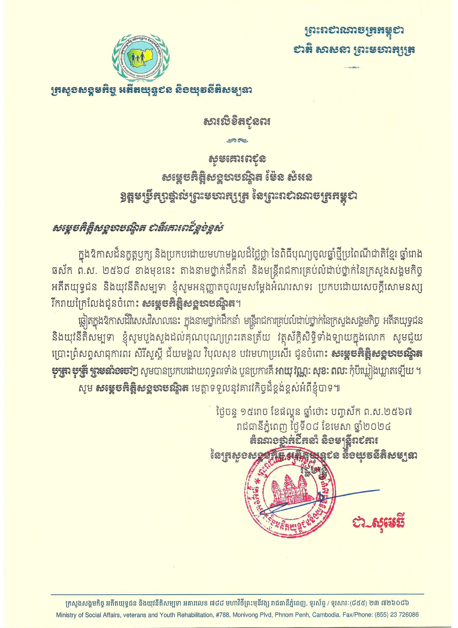 ឯកឧត្តមរដ្ឋមន្ត្រី ជា សុមេធី ផ្ញើរសារលិខិតជូនពរ សូមគោរពជូន សម្ដេចកិត្តិសង្គហបណ្ឌិត ម៉ែន សំអន ឧត្តមប្រឹក្សាផ្ទាល់ព្រះមហាក្សត្រ នៃព្រះរាជាណាចក្រកម្ពុជា ជាទីគោរពដ៏ខ្ពង់ខ្ពស់បំផុត ក្នុងឱកាសចូលឆ្នាំថ្មី ប្រពៃណីជាតិខ្មែរ ឆ្នាំរោង ឆស័ក ព.ស ២៥៦៨ ត្រូវនឹងថ្ងៃទី១៣ ខែមេសា ឆ្នាំ២០២៤ ខាងមុខនេះ។