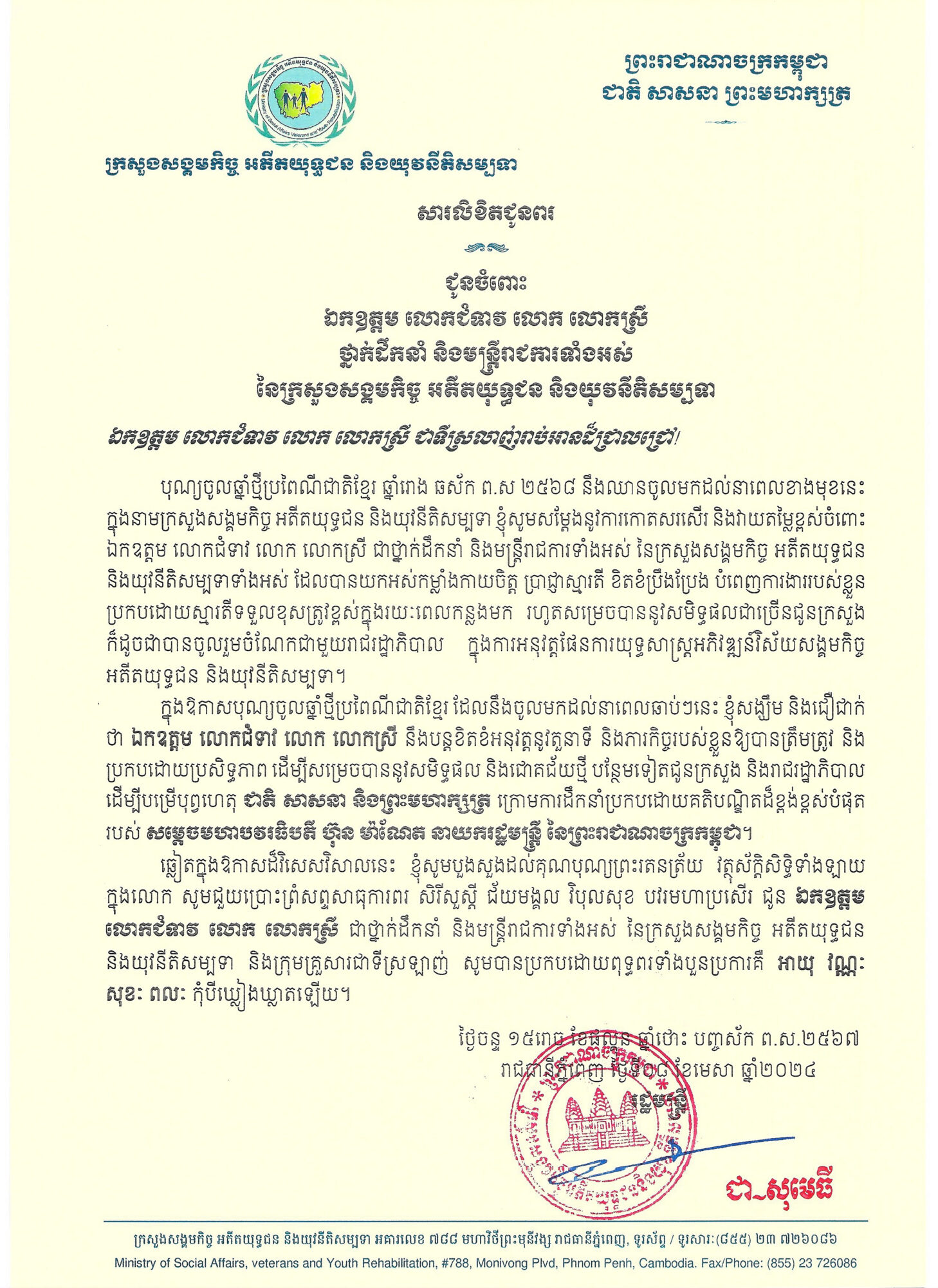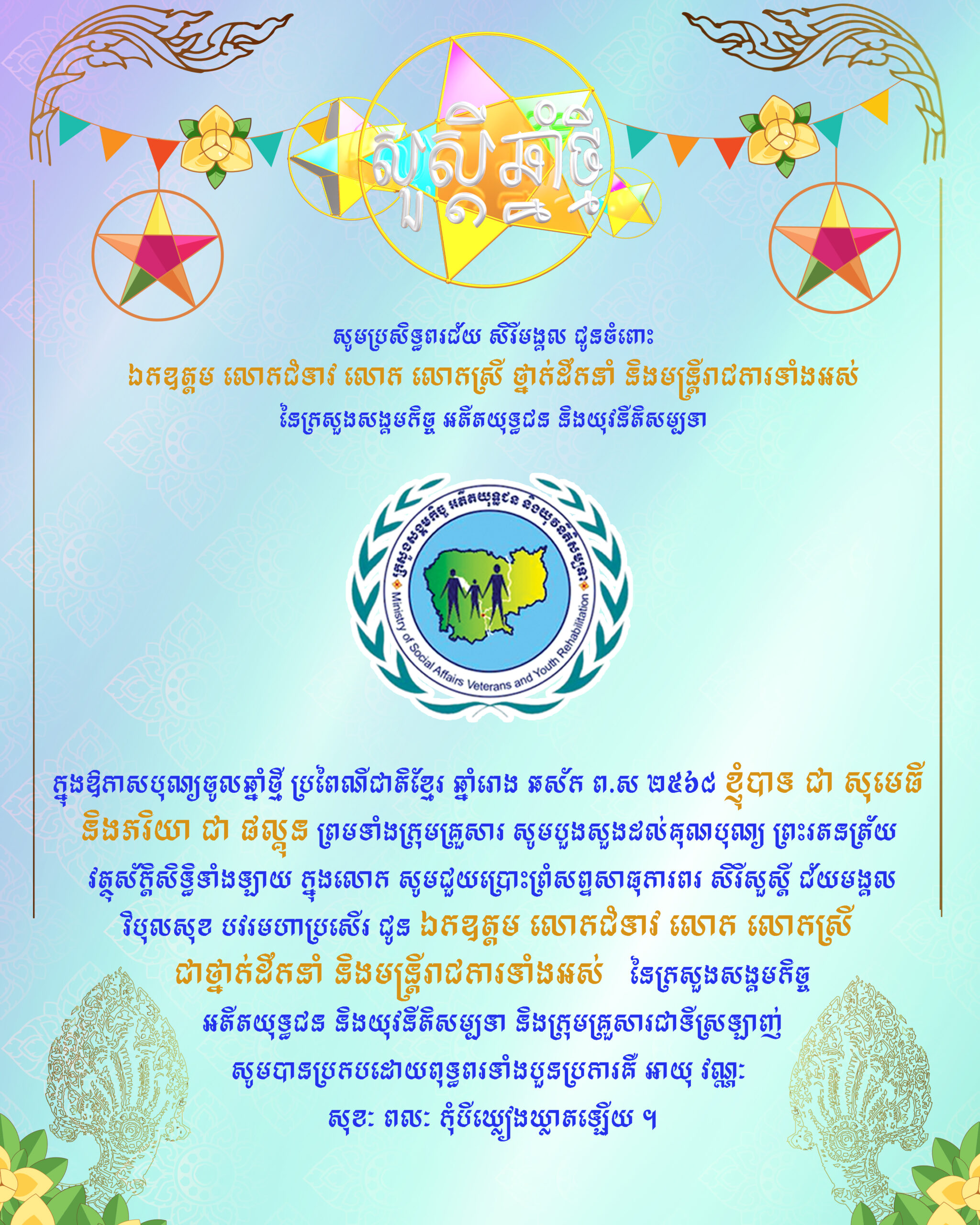 ឯកឧត្តមរដ្ឋមន្ត្រី ជា សុមេធី ផ្ញើរសារលិខិតជូនពរ សូមជូនពរ ឯកឧត្តម លោកជំទាវ លោក លោកស្រី ថ្នាក់ដឹកនាំ និងមន្ត្រីរាជការទាំងអស់ នៃក្រសួងសង្គមកិច្ច អតីតយុទ្ធជន និងយុវនីតិសម្បទា ក្នុងឱកាសចូលឆ្នាំថ្មី ប្រពៃណីជាតិខ្មែរ ឆ្នាំរោង ឆស័ក ព.ស ២៥៦៨ ត្រូវនឹងថ្ងៃទី១៣ ខែមេសា ឆ្នាំ២០២៤ ខាងមុខនេះ។