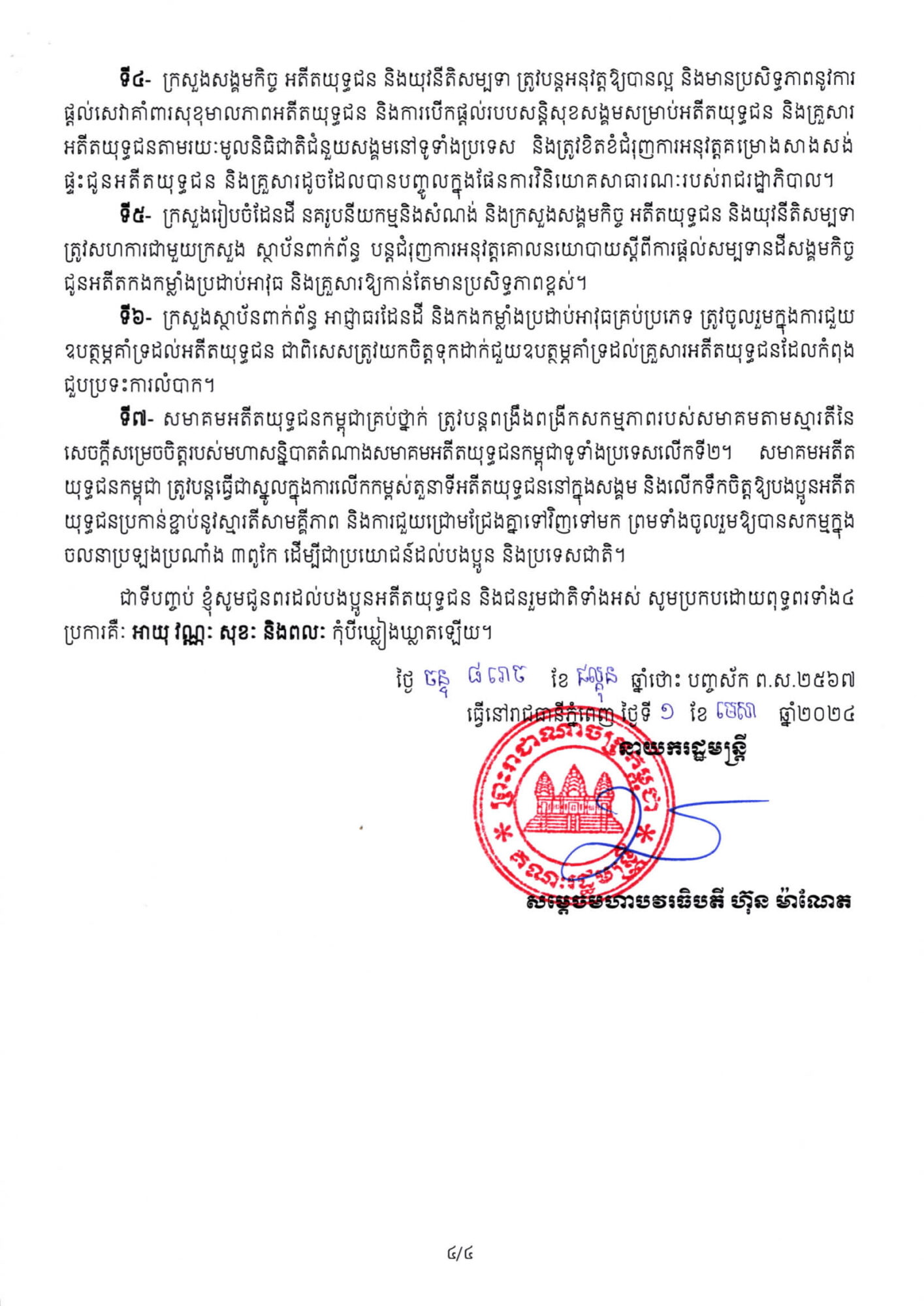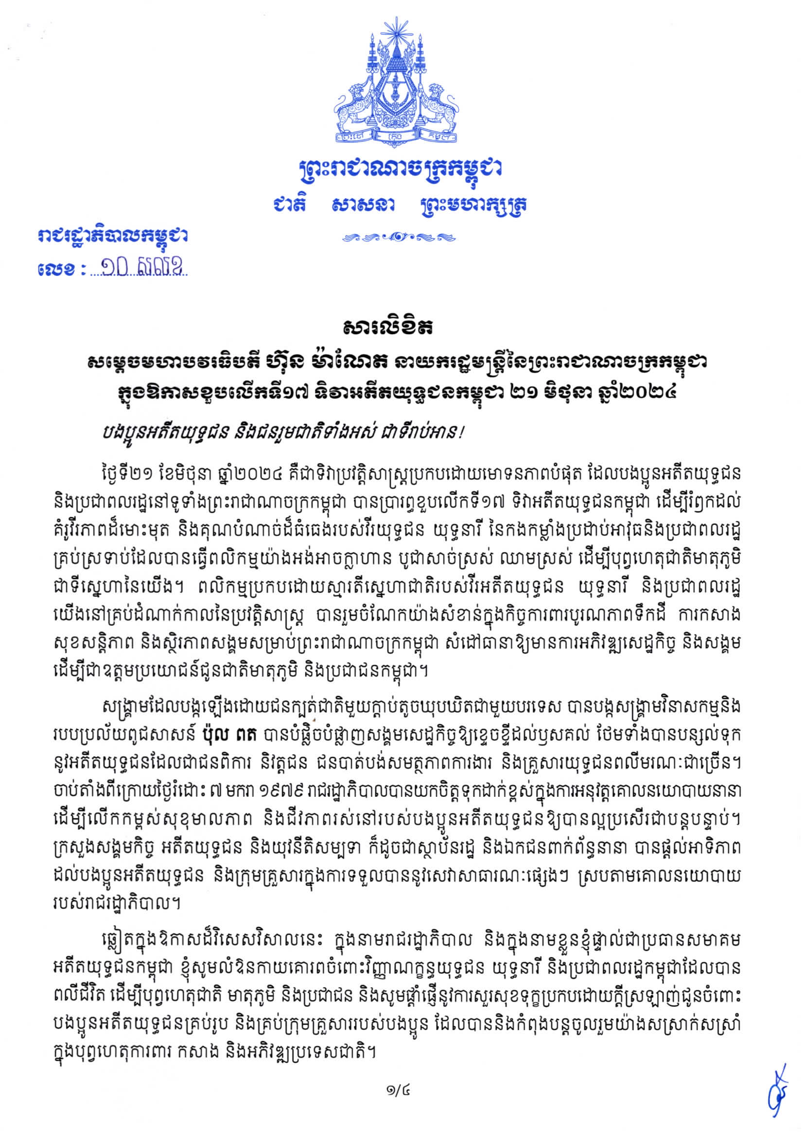 សារលិខិត សម្ដេចមហាបវរធិបតី ហ៊ុន ម៉ាណែត នាយករដ្ឋមន្រ្តីនៃព្រះរាជាណាចក្រកម្ពុជា ក្នុងឱកាសខួបលើកទី១៧ ទិវាអតីតយុទ្ធជនកម្ពុជា ២១ មិថុនា ឆ្នាំ២០២៤សារលិខិត សម្ដេចមហាបវរធិបតី ហ៊ុន ម៉ាណែត នាយករដ្ឋមន្រ្តីនៃព្រះរាជាណាចក្រកម្ពុជា ក្នុងឱកាសខួបលើកទី១៧ ទិវាអតីតយុទ្ធជនកម្ពុជា ២១ មិថុនា ឆ្នាំ២០២៤