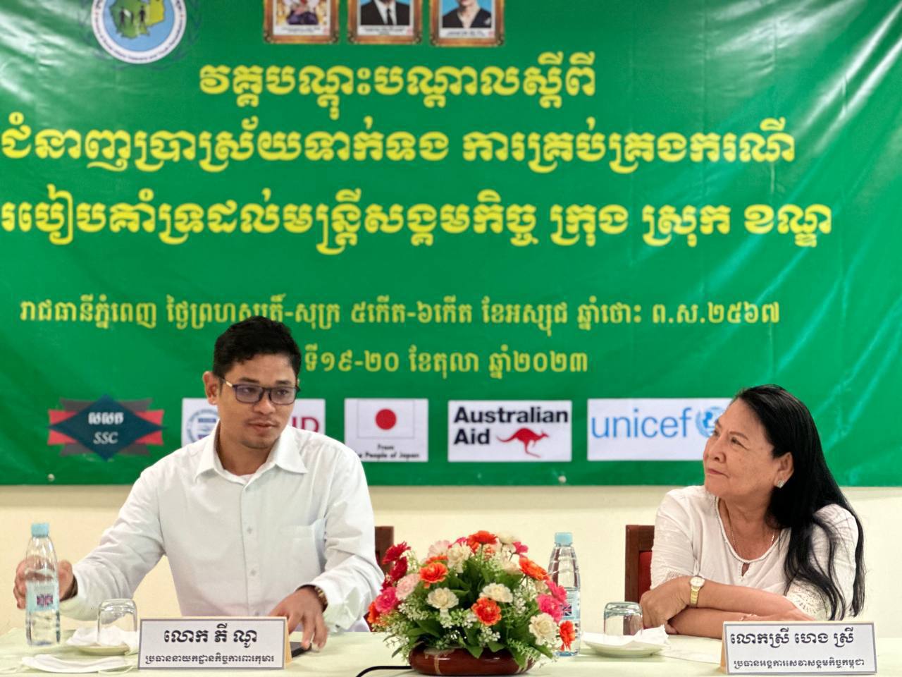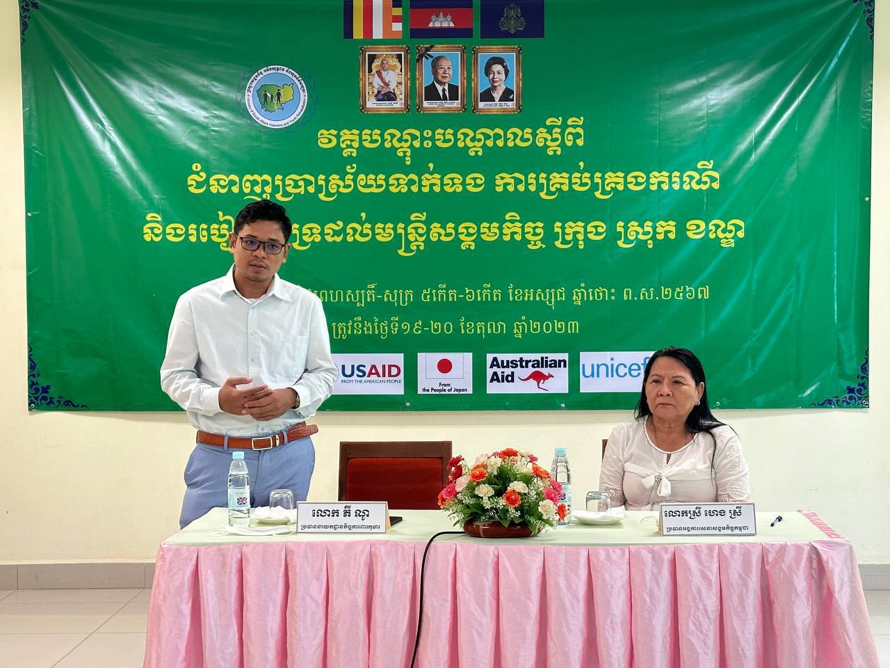 ថ្ងៃព្រហស្បតិ៍ ៥កេីត ខែអស្សុជ ឆ្នាំថោះ បញ្ចស័ក ព.ស.២៥៦៧ ត្រូវនឹងថ្ងៃទី១៩ ខែតុលា ឆ្នាំ២០២៣ លោក ភី ណូ ប្រធាននាយកដ្ឋានកិច្ចការពារកុមារ តំណាងឯកឧត្តម ឌីន បូរី អគ្គនាយកនៃអគ្គនាយកដ្ឋានសេវាសង្គមកិច្ច បានចូលរួមបេីកវគ្គបណ្ដុះបណ្ដាលស្តីពី “ជំនាញប្រាស្រ័យទាក់ទង ការគ្រប់គ្រងករណី និងរបៀបគាំទ្រដល់មន្រ្តីសង្គមកិច្ចក្រុង ស្រុក ខណ្ឌ” ដល់មន្ត្រីនាយកដ្ឋានកិច្ចការពារកុមារ ចំនួន ១៥រូប ដែលសហការរៀបចំដោយអង្គការសេវាសង្គមកិច្ចកម្ពុជា និងនាយកដ្ឋានកិច្ចការពារកុមារ។