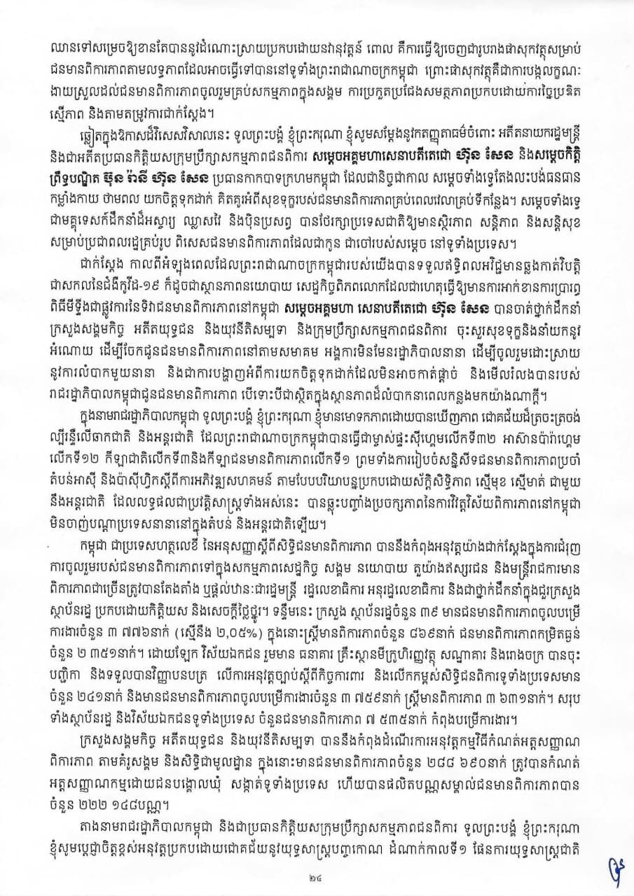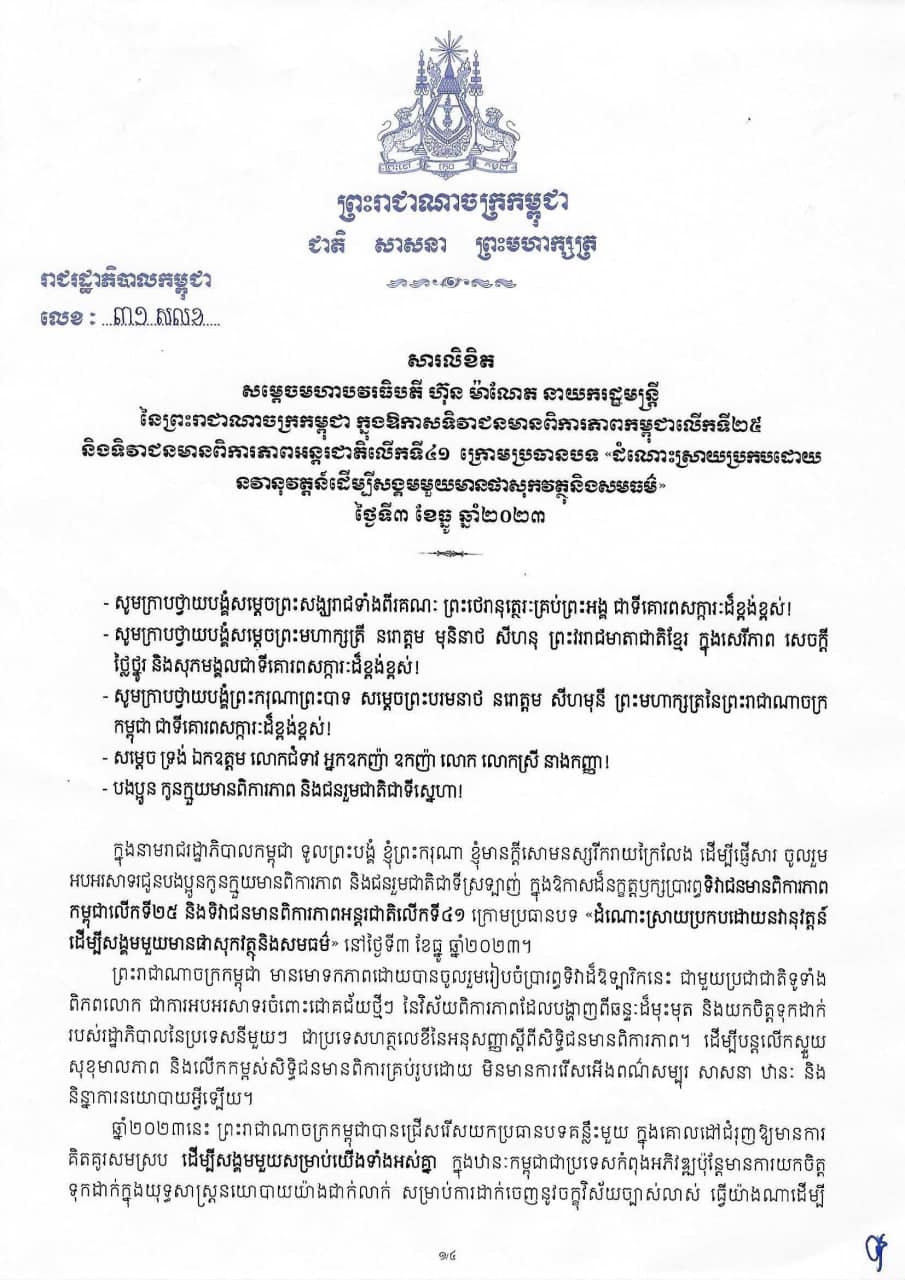 រាជរដ្ឋាភិបាលបានអះអាងបែបនេះក្នុងសារលិខិតនាឱកាសទិវាជនមានពិការភាព កម្ពុជាលើកទី២៥ និងទិវាជនមានពិការភាពអន្តរជាតិលើកទី៤១ ក្រោមប្រធានបទ «ដំណោះស្រាយប្រកបដោយនវានុវត្តន៍ ដើម្បីសង្គមមួយមានផាសុកវត្ថុនិងសមធម៌» នៅថ្ងៃទី៣ ខែធ្នូ ឆ្នាំ២០២៣។