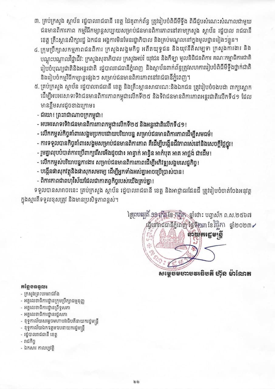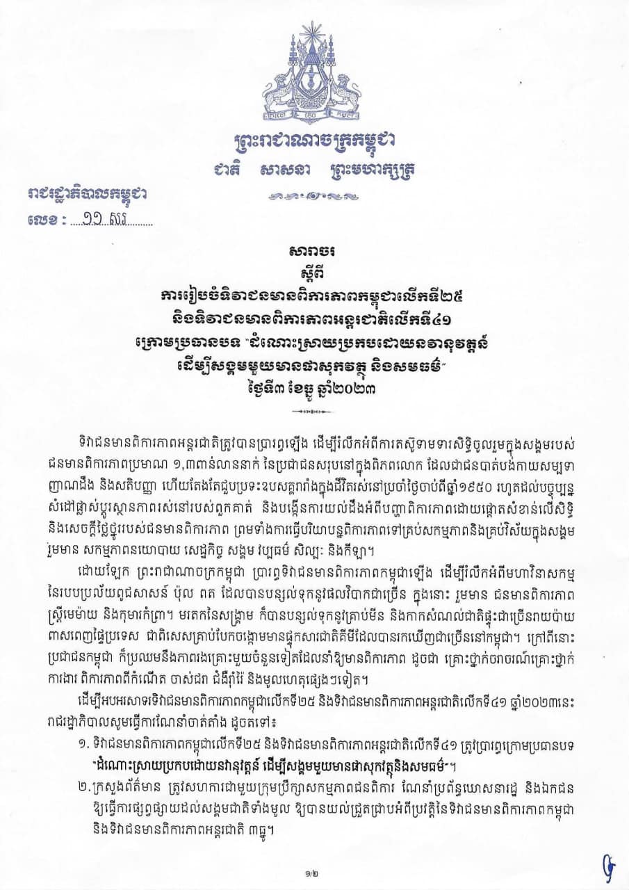 យោងតាមសារាចរ ការរៀបចំទិវាជនមានពិការភាពកម្ពុជាលើកទី២៥ និងទិវាជនមានពិការភាពអន្តជាតិលើកទី៤១ ក្រោមប្រធានបទ ដំណោះស្រាយប្រកបដោយនវានុវត្តន៍ ដើម្បីសង្គមមួយមានផាសុកវត្ថុ និងសមធម៌ នាថ្ងៃទី៣ ខែធ្នូ ឆ្នាំ២០២៣ ខាងមុខ រាជរដ្ឋាភិបាលណែនាំគ្រប់ក្រសួង ស្ថាប័ន រដ្ឋបាលរាជធានី ខេត្ត ដៃគូពាក់ព័ន្ធ ត្រូវរៀបចំពិធីមិទ្ទីង ពិធីជួបសំណេះសំណាលជាមួយ ជនមានពិការភាព កម្មវិធីកម្សាន្តសប្បាយសម្រាប់ជនមានពិការភាពនៅតាមក្រសួង ស្ថាប័ន រដ្ឋបាល រាជធានី ខេត្ត គ្រឹះស្ថានសិក្សារដ្ឋ ឯកជន អង្គការមិនមែនរដ្ឋាភិបាល និងគ្រប់មណ្ឌលនៅក្នុងមូលដ្ឋានរៀងៗខ្លួន។