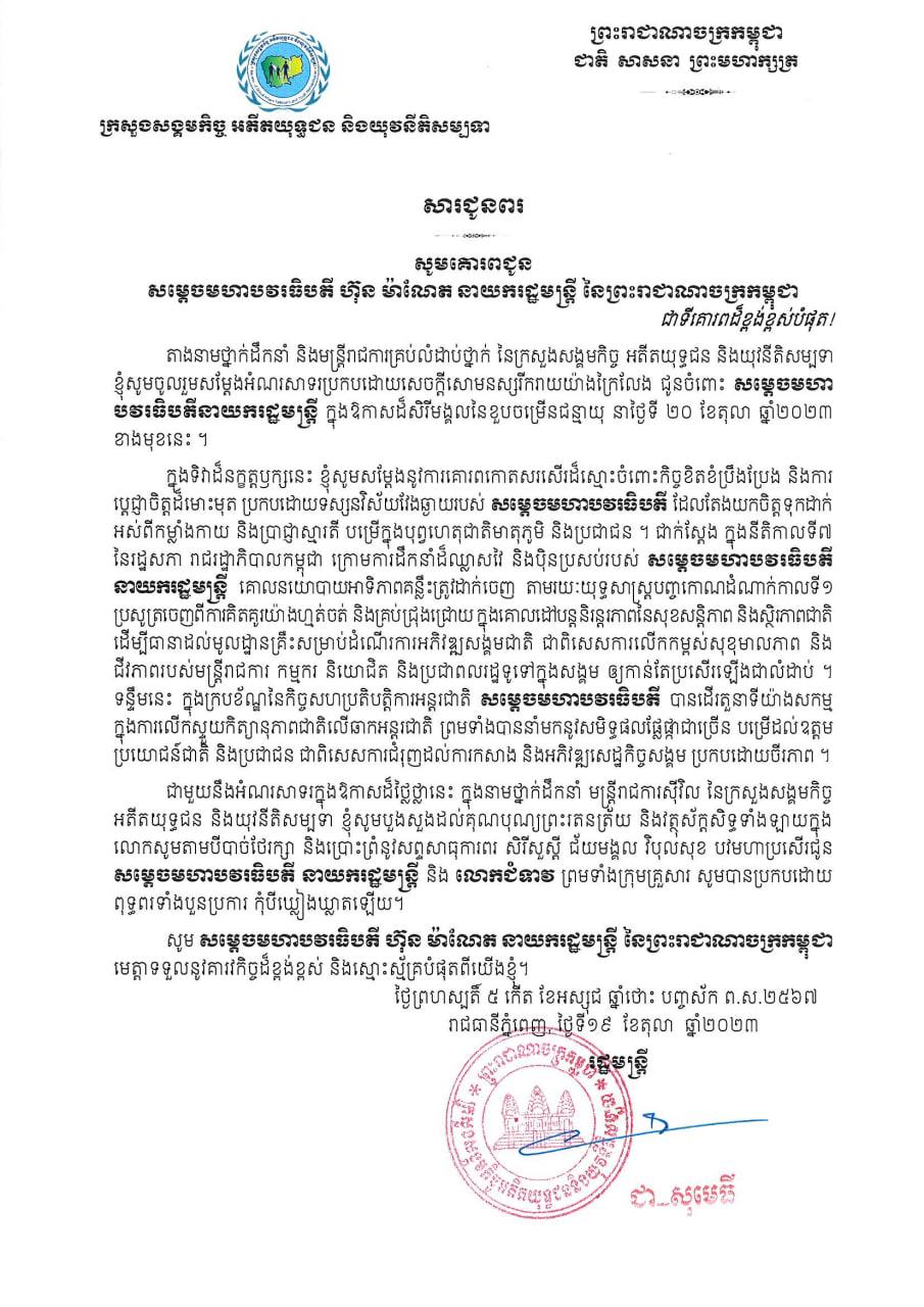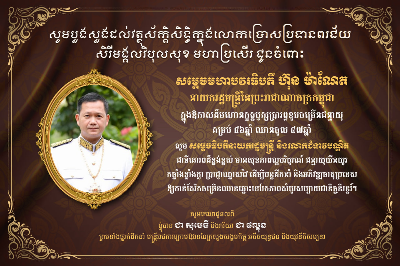 ជាមួយនឹងអំណរសាទរក្នុងឱកាសដ៏ថ្លៃថ្លានេះ ក្នុងនាមថ្នាក់ដឹកនាំ មន្ត្រីរាជការស៊ីវិល នៃក្រសួងសង្គមកិច្ច អតីតយុទ្ធជន និងយុវនីតិសម្បទា ឯកឧត្តមរដ្ឋមន្ត្រី ជា សុមេធី បានសូមបួងសួងដល់គុណបុណ្យព្រះរតនត្រ័យ និងវត្ថុស័ក្កសិទ្ធទាំងឡាយក្នុង លោកសូមតាមបីបាច់ថែរក្សា និងប្រោះព្រំនូវសព្ទសាធុការពរ សិរីសួស្តី ជ័យមង្គល វិបុលសុខ បវមហាប្រសើរជូន សម្តេចមហាបវរធិបតី នាយករដ្ឋមន្ត្រី និង លោកជំទាវ ព្រមទាំងក្រុមគ្រួសារ សូមបានប្រកបដោយ ពុទ្ធពរទាំងបួនប្រការ កុំបីឃ្លៀងឃ្លាតឡើយ