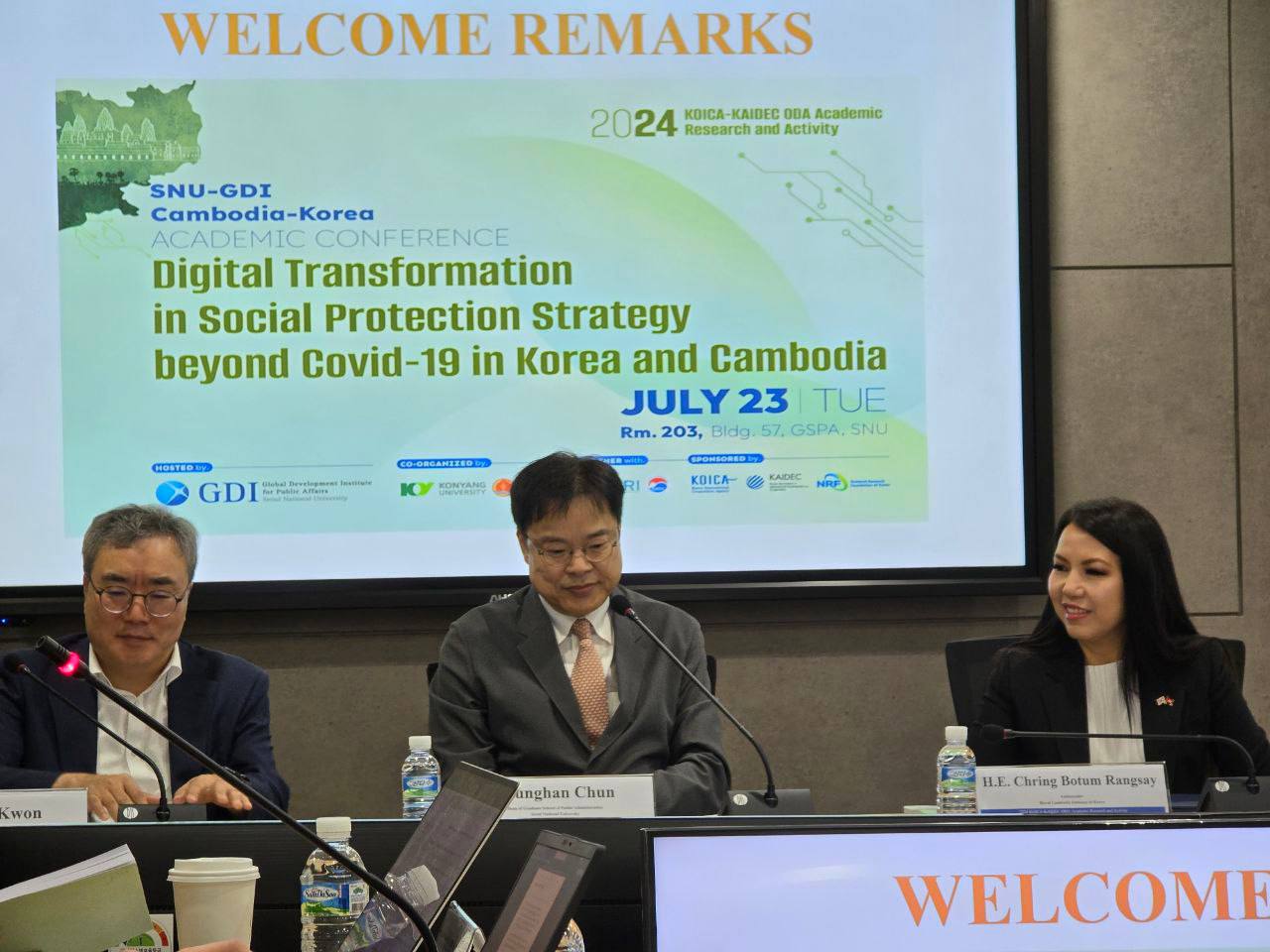 ទីក្រុងសេអ៊ូល៖ ថ្ងៃអង្គារ ៣រោច ខែអាសាឍ ឆ្នាំរោង ឆស័ក ពុទ្ធសករាជ ២៥៦៨ ត្រូវនឹងថ្ងៃទី២៣ ខែកក្កដា ឆ្នាំ២០២៤ ឯកឧត្តម សរ បូរីរក្ស នាយកវិទ្យាស្ថានជាតិសង្គមកិច្ច  និងជានាយកខុទ្ទកាល័យរដ្ឋមន្ត្រី នៃក្រសួងសង្គមកិច្ច អតីតយុទ្ធជន និងយុវនីតិសម្បទា បានដឹកនាំក្រុមការងាររបស់ក្រសួងសង្គមកិច្ច អតីតយុទ្ធជន និងយុវនីតិសម្បទា អញ្ជើញចូលរួម និងជាវាគ្មិនក្នុងសិក្ខាសាលាអប់រំស្តីពីឌីជីថលនីយកម្មក្នុងយុទ្ធសាស្ត្រគាំពារសង្គមក្រោយវិបត្តិកូវីដ-១៩ នៅប្រទេសកូរ៉េ និងកម្ពុជា ដែលប្រព្រឹត្តទៅនៅសាកលវិទ្យាល័យជាតិសេអ៊ូល (SNU) នៃសាធារណ:រដ្ឋកូរ៉េ។