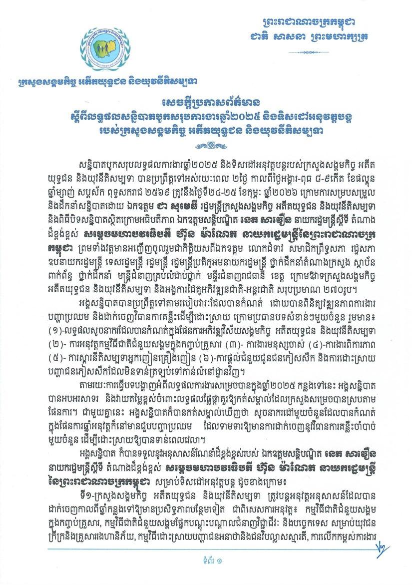 សេចក្តីប្រកាសព័ត៌មានស្តីពីលទ្ធផលសន្និបាតបូកសរុបការងារឆ្នាំ២០២៥ និងទិសដៅអនុវត្តបន្តរបស់ក្រសួងសង្គមកិច្ច អតីតយុទ្ធជន និងយុវនីតិសម្បទា