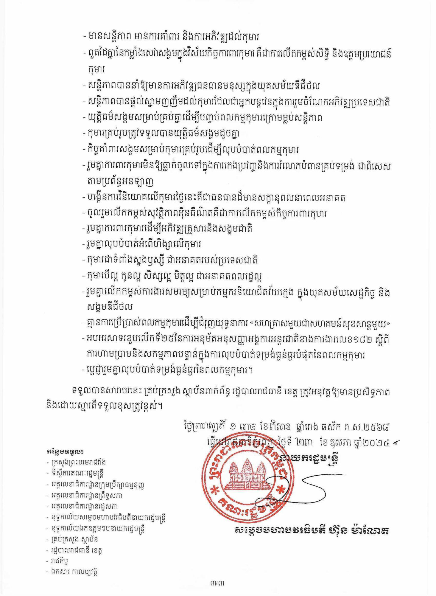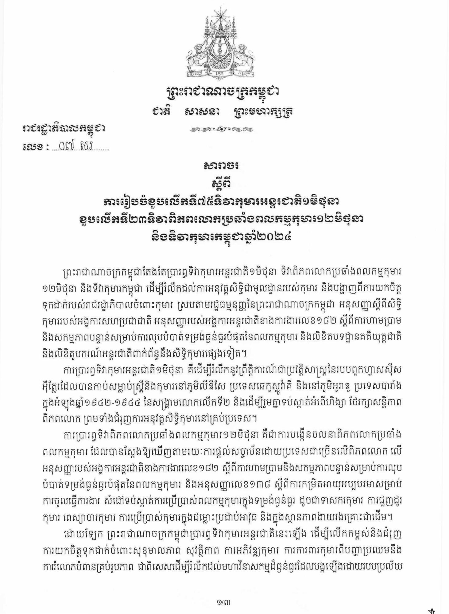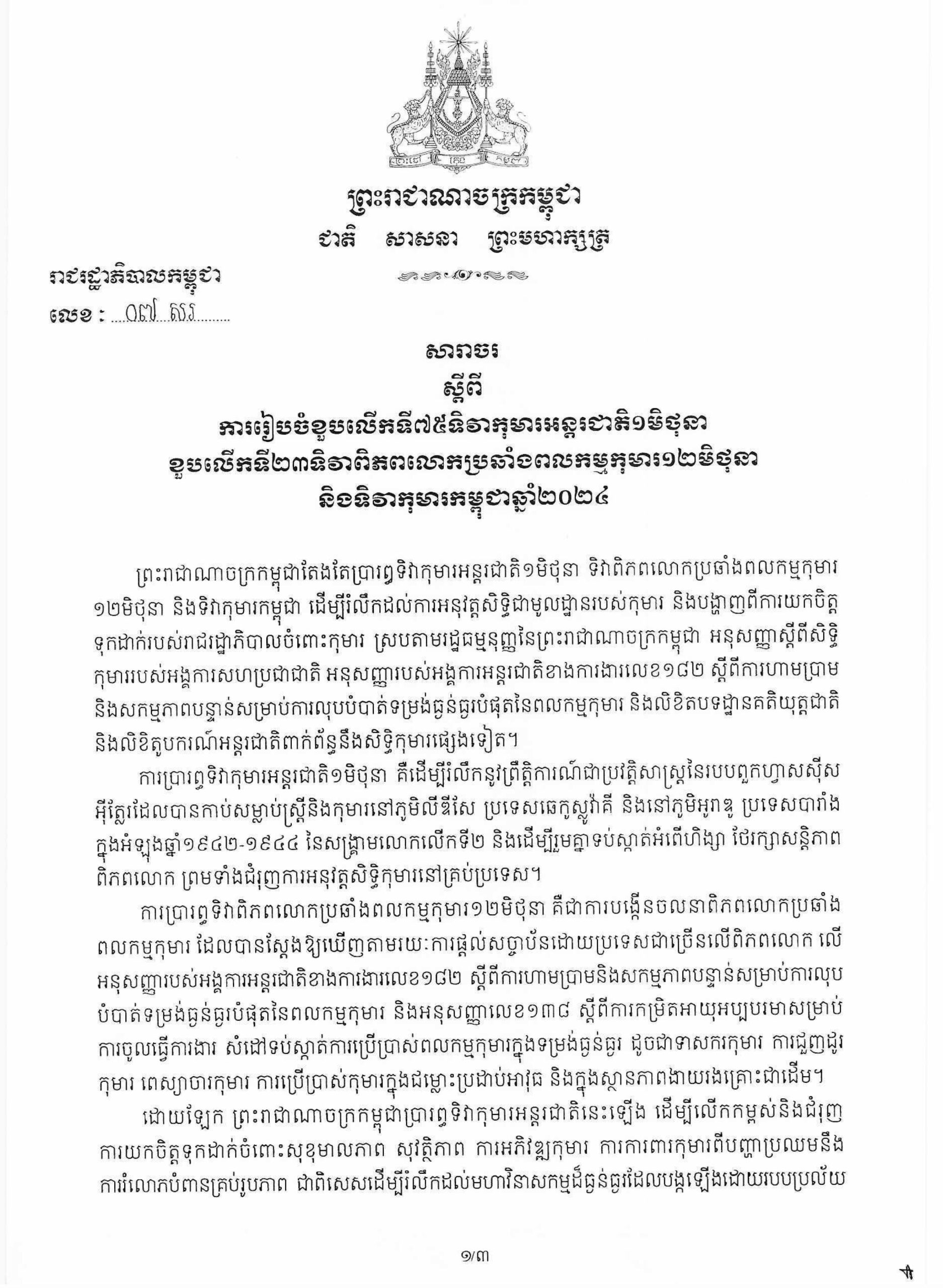 សារាចររបស់រាជរដ្ឋាភិបាលកម្ពុជាស្ដីពី ការរៀបចំខួបលើកទី៧៥ទិវាកុមារអន្តរជាតិ១មិថុនា ខួបលើកទី២៣ទិវាពិភពលោកប្រឆាំងពលកម្មកុមារ១២មិថុនា និងទិវាកុមារកម្ពុជា២០២៤