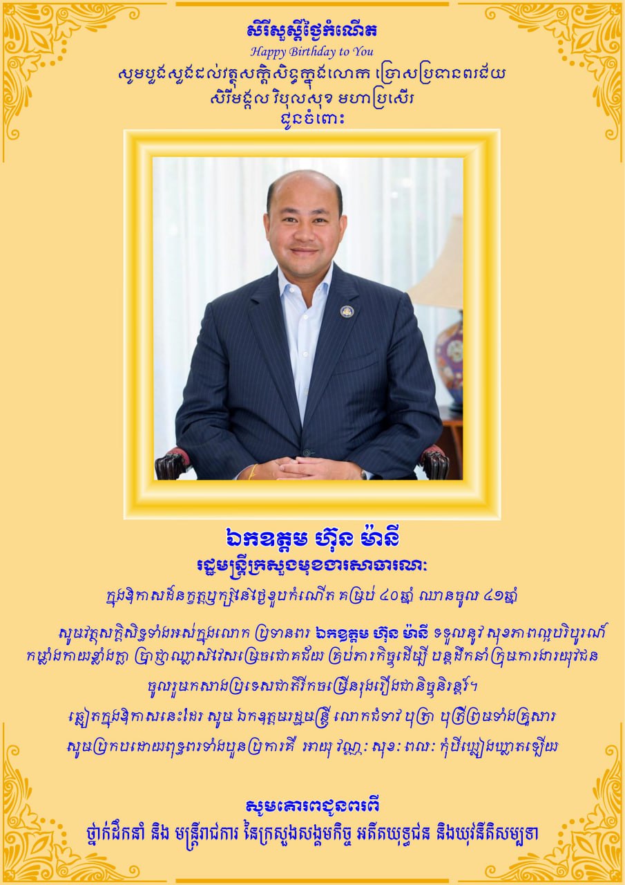 ក្នុងឱកាសដ៏នក្ខត្តឫក្សនៃថ្ងៃខួបកំណើតគម្រប់ ៤០ឆ្នាំ ឈានចូល ៤១ឆ្នាំរបស់ឯកឧត្តម ហ៊ុន ម៉ានី រដ្ឋមន្ត្រីក្រសួងមុខងារសាធារណៈ, យើងខ្ញុំទាំងអស់គ្នាជាថ្នាក់ដឹកនាំ និងមន្ត្រីរាជការនៃក្រសួងសង្គមកិច្ច អតីតយុទ្ធជន និងយុវនីតិសម្បទា សូមបួងសួងវត្ថុសក្តិសិទ្ធក្នុងលោប្រោសប្រទានពរជ័យសិរីមង្គល វិបុលសុខ មហាប្រសើរជូនចំពោះ ឯកឧត្តមរដ្ឋមន្ត្រី សូមទទួលនូវសុខភាពល្អបរិបូរណ៍ កម្លាំងកាយខ្លាំងក្លា ប្រាជ្ញាឈ្លាសវៃ សម្រេចបានជោគជ័យគ្រប់ភារកិច្ចដើម្បីបន្តដឹកនាំក្រសួងមុខងារសាធារណៈ និងក្រុមការងារយុវជនចូលរួមកសាងប្រទេសជាតិឱ្យរីកចម្រើនរុងរឿងជានិច្ចនិរន្តរ៍៕