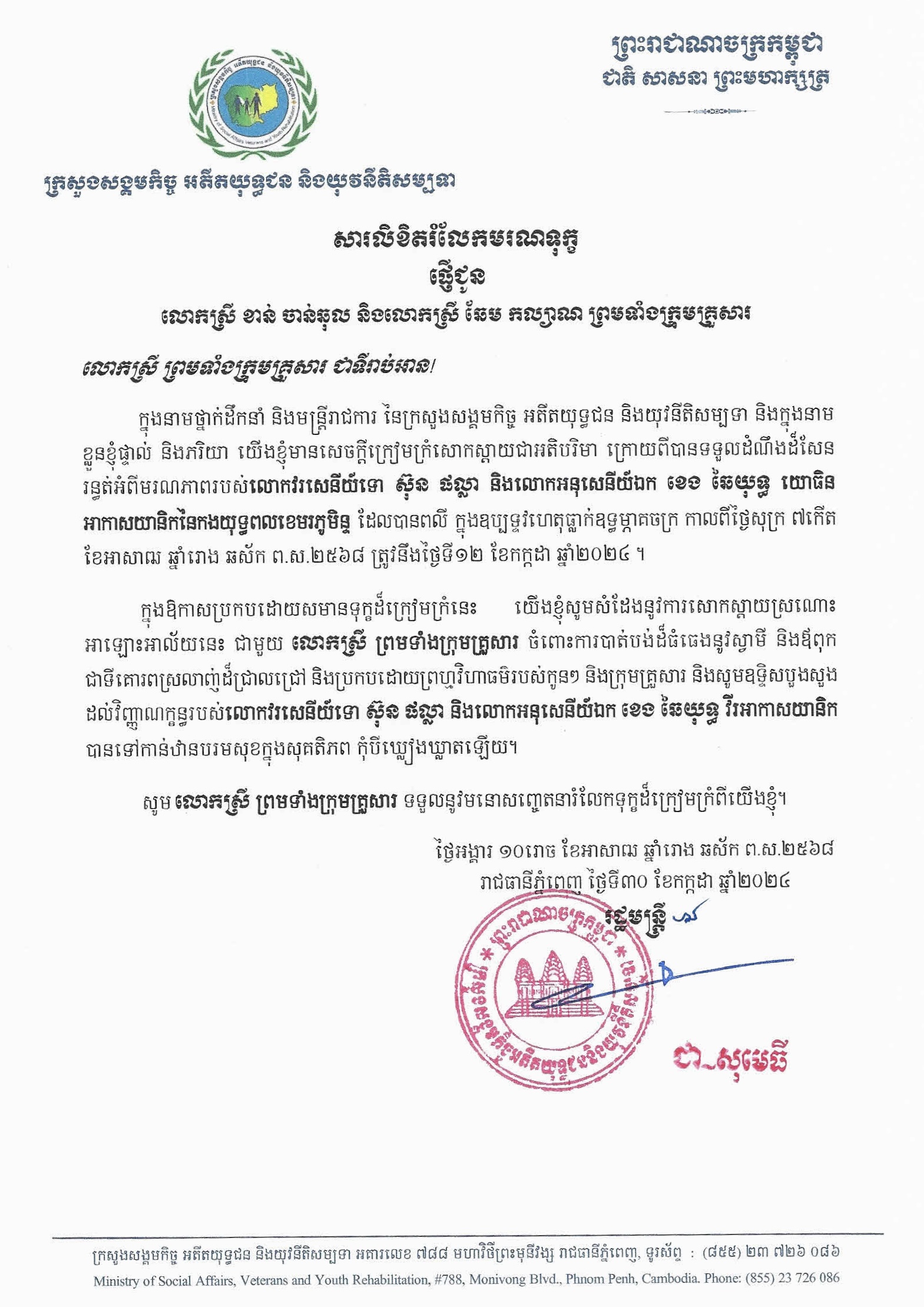 ឯកឧត្តម ជា សុមេធី និងលោកជំទាវ ជា ផល្គុន ក្នុងនាមថ្នាក់ដឹកនាំ និងមន្ត្រីរាជការ នៃក្រសួងសង្គមកិច្ច អតីតយុទ្ធជន និងយុវនីតិសម្បទា ផ្ញេីរសារលិខិតចូលរួមរំលែកទុក្ខដ៏ក្រៀមក្រំជាមួយលោកស្រី ខាន់ ចាន់ឆុល និងលោកស្រី ឆែម កល្យាណ ព្រមទាំងក្រុមគ្រួសារ ចំពោះមរណភាពរបស់លោកវរសេនីយ៍ទោ ស៊ុន ផល្លា និងលោកអនុសេនីយ៍ឯក ខេង ឆៃយុទ្ធ ជាទីគោរពស្រលាញ់បំផុត!