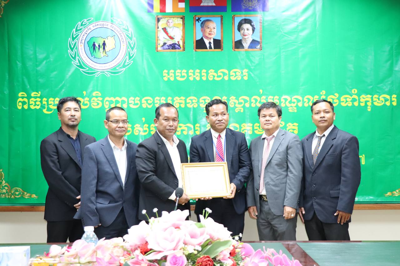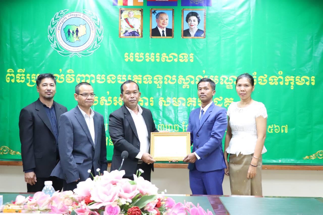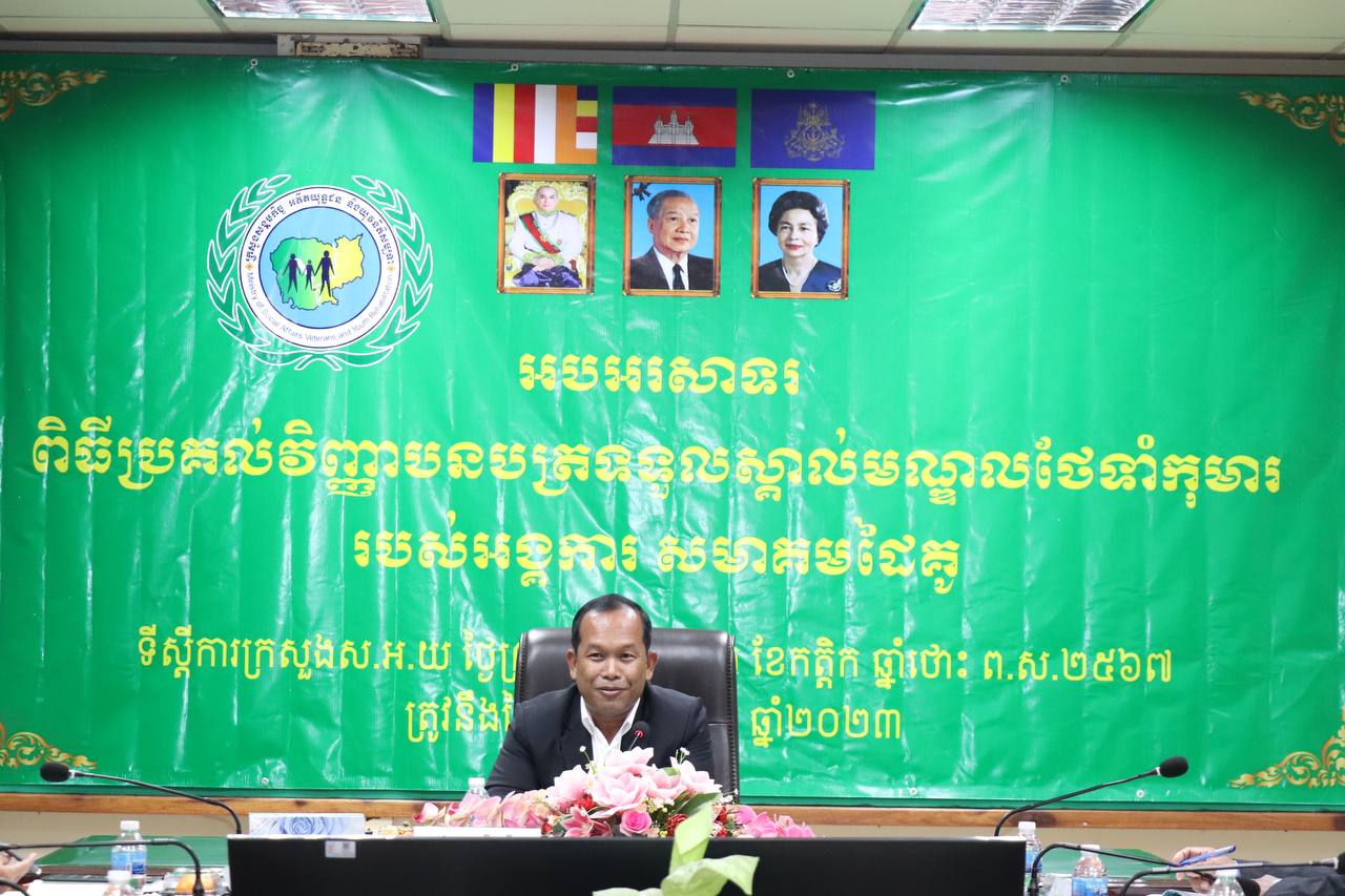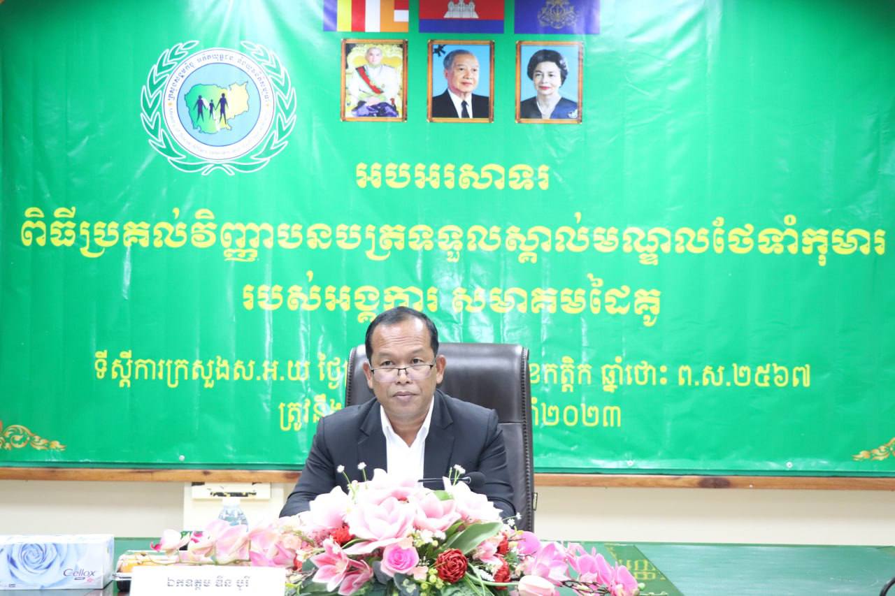 រាជធានីភ្នំពេញ÷ ថ្ងៃព្រហស្បតិ៍ ទី៣០ ខែវិច្ឆិកា ឆ្នាំ២០២៣ នាយកដ្ឋានកិច្ចការពារកុមារ បានរៀបចំពិធីអបអរសាទរប្រគល់វិញ្ញាបនបត្រទទួលស្គាល់មណ្ឌលថែទាំកុមារ ក្រោមអធីបតីភាព ឯកឧត្តម ឌីន បូរី អគ្គនាយកសេវាសង្គមកិច្ច នៃក្រសួងសង្គមកិច្ច អតីតយុទ្ធជន និងយុវនីតិសម្បទា។