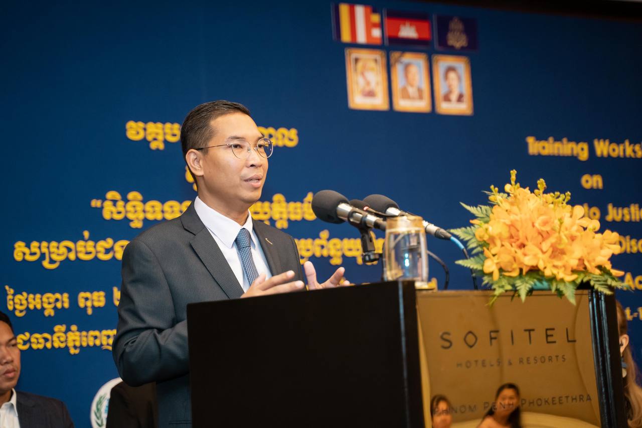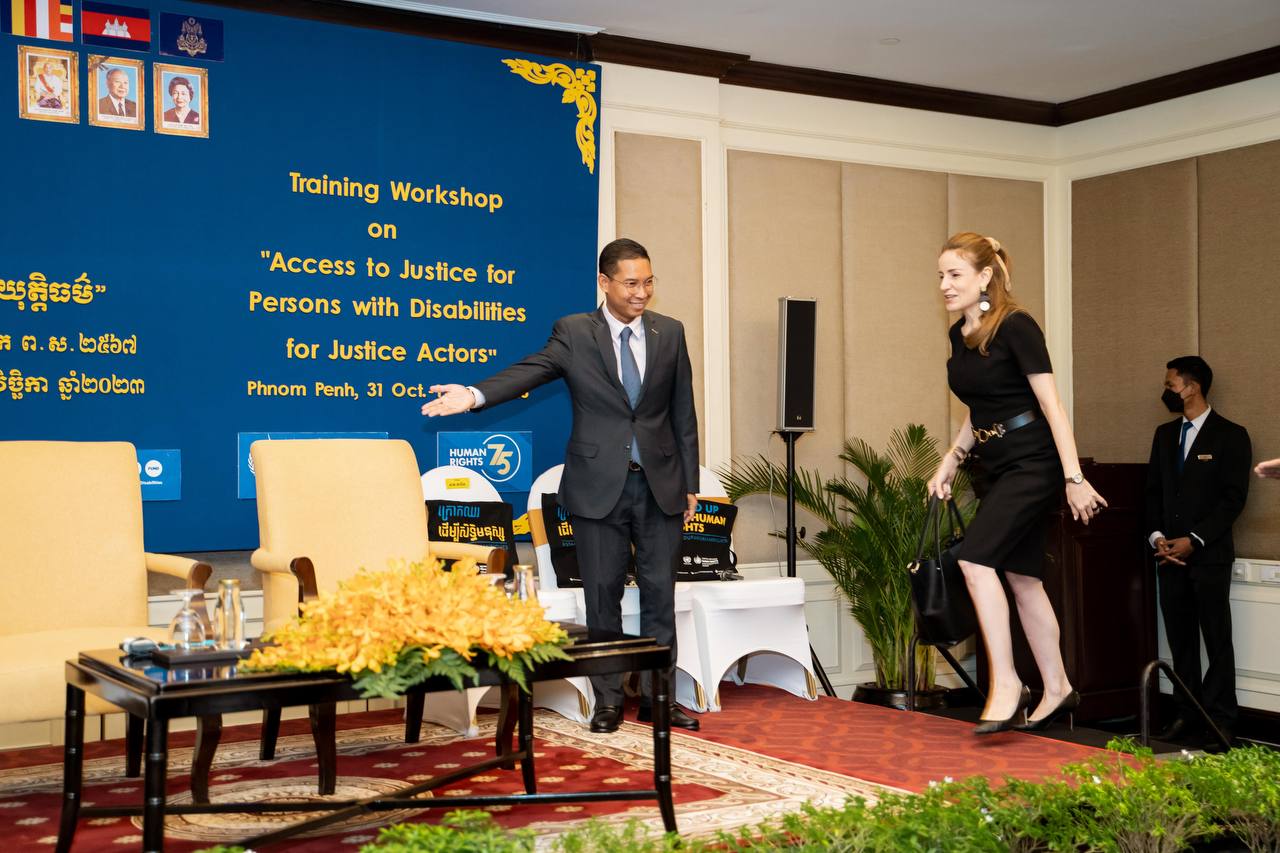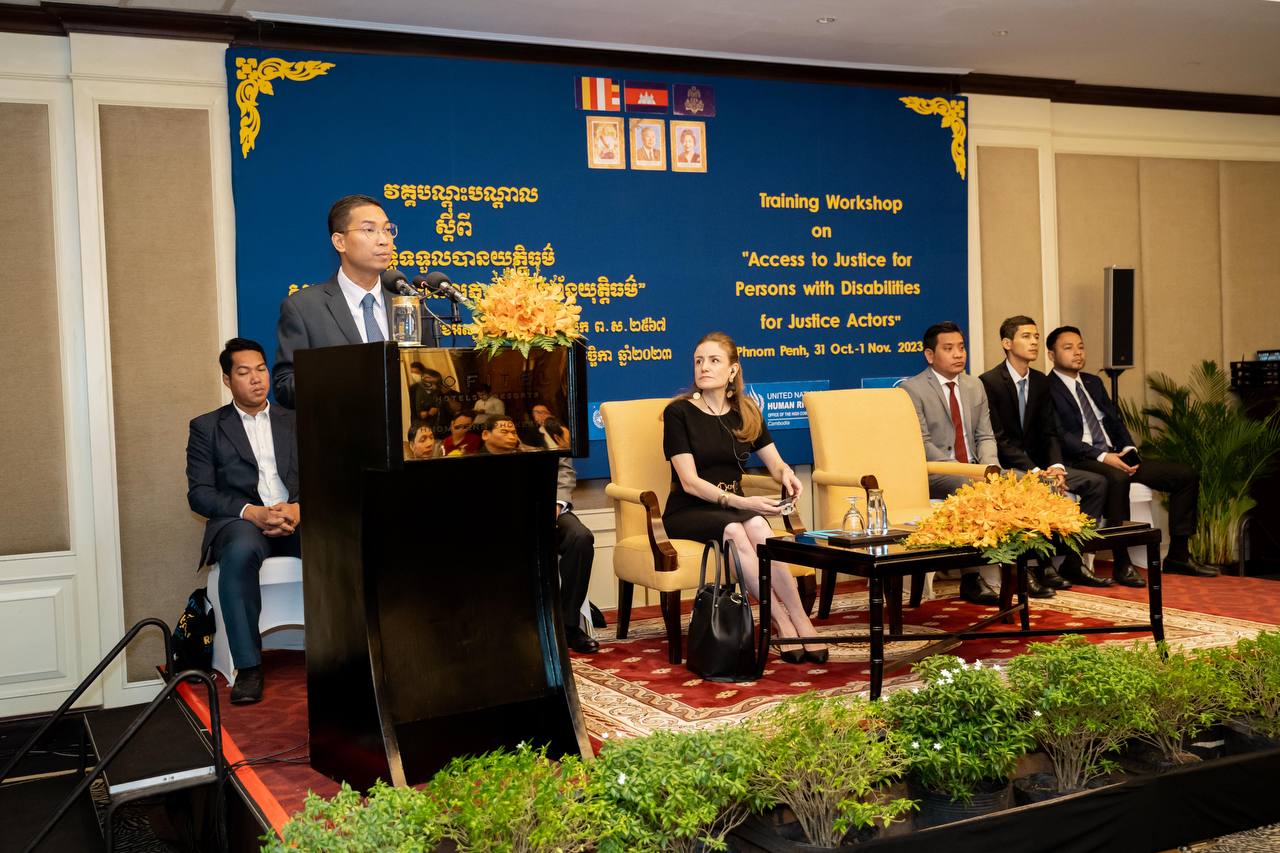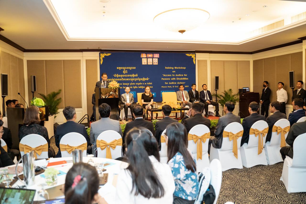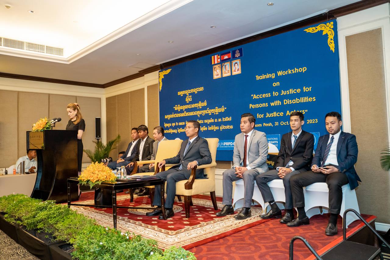 ថ្លែងក្នុងពិធីបើកវគ្គបណ្ដុះបណ្ដាលស្ដីពី «សិទ្ធិទទួលបានយុត្តិធម៌សម្រាប់ជនមានពិការភាពក្នុងប្រព័ន្ធយុត្តិធម៌» ក្នុងរាជធានីភ្នំពេញ នៅព្រឹកថ្ងៃអង្គារ៍ ទី៣១ ខែតុលា ឆ្នាំ២០២៣នេះ តំណាងរដ្ឋមន្ត្រីសង្គមកិច្ច ឯកឧត្តម ឯម ច័ន្ទមករា បានលើកឡើងថា បន្ទាប់ពីក្លាយទៅជារដ្ឋភាគីនៃអនុសញ្ញាស្ដីពីសិទ្ធិជនមានពិការភាព កម្ពុជាបានធ្វើការងារជាបន្តបន្ទាប់ដើម្បីជំរុញដល់សិទ្ធិជនមានពិការភាពនៅកម្ពុជា។ ក្រៅពីនេះអគ្គលេខាធិការដ្ឋានក្រុមប្រឹក្សាសកម្មភាពជនពិការ បានសហការជាមួយដៃគូអភិវឌ្ឍនានា រួមទាំងការិយាល័យឧត្តមស្នងការអង្គការសហប្រជាជាតិទទួលបន្ទុកសិទ្ធិមនុស្សប្រចាំនៅកម្ពុជា ដើម្បីបង្កើន ការយល់ដឹងអំពីការងារពិការភាព សេវាជំនួយផ្លូវច្បាប់ដល់មន្ត្រីយុត្តិធម៌ និងជនមានពិការភាព សំដៅធានាដល់ការទទួលស្គាល់ភាពស្មើគ្នាចំពោះ មុខច្បាប់ ការទទួលបានយុត្តិធម៌ សិទិ្ធសេរីភាព និងសន្តិសុខបុគ្គល ព្រមទាំងសិទ្ធិចាកផុតពីការធ្វើបាបឬការធ្វើអំពើ ឃោរឃៅអមនុស្សធម៌ ឬបន្ទាបបន្ថោក ឬការដាក់ទារុណកម្មលើជនមានពិការភាពជាដើម។