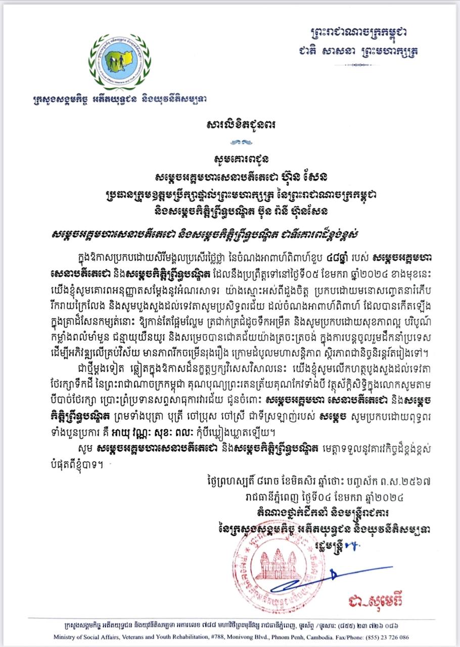 តាងនាមថ្នាក់ដឹកនាំ និងមន្ត្រីរាជការគ្រប់លំដាប់ថ្នាក់នៃក្រសួងសង្គមកិច្ច អតីតយុទ្ធជន និងយុវនីតិសម្បទា សូមគោរពសម្តែងនូវសេចក្តីសោមនស្សរីករាយ ចំពោះ សម្ដេចអគ្គមហាសេនាបតីតេជោ ហ៊ុន សែន ប្រធានឧត្ដមក្រុមប្រឹក្សាព្រះមហាក្សត្រ និងសម្ដេចកិត្តិព្រឹទ្ធបណ្ឌិត ប៊ុន រ៉ានី ហ៊ុនសែន ប្រធានកាកបាទក្រហមកម្ពុជា ក្នុងឱកាសប្រកបដោយសិរីមង្គលប្រសើរថ្លៃថ្លា នៃចំណងអាពាហ៍ពិពាហ៍ខួប ៤៨ឆ្នាំ៕