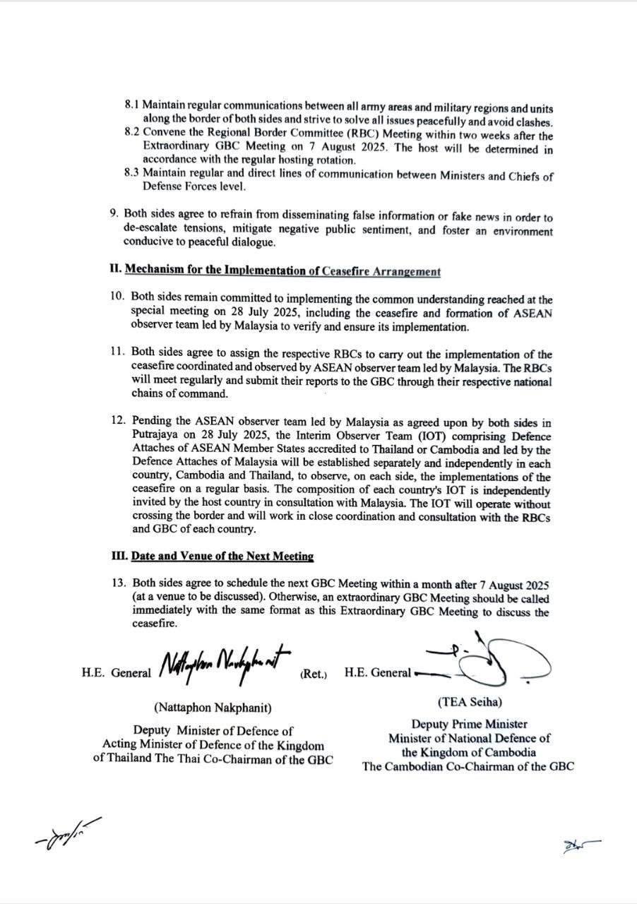 ១០. ភាគីទាំងពីរនៅតែប្តេជ្ញាចិត្តចំពោះការយោគយល់ដែលបានឈានដល់ក្នុងការប្រជុំពិសេសនៅថ្ងៃទី ២៨ ខែកក្កដា ឆ្នាំ២០២៥ ដែលរួមមានការបញ្ឈប់បាញ់ប្រហារ និងការបង្កើតក្រុមសង្កេតការណ៍អាស៊ានដែលដឹកនាំដោយម៉ាឡេស៊ីដើម្បីផ្ទៀងផ្ទាត់ និងធានាការអនុវត្ត។