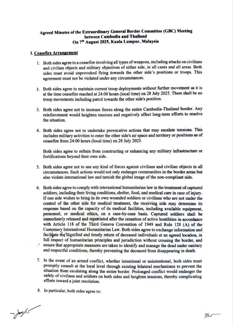 ១៣. ភាគីទាំងពីរឯកភាពគ្នាថា នឹងកំណត់ការប្រជុំ GBC លើកក្រោយនៅក្នុងរយៈពេលមួយខែបន្ទាប់ពីថ្ងៃទី ៧ ខែសីហា ឆ្នាំ ២០២៥ (នៅទីកន្លែងដែលត្រូវបានពិភាក្សា)។ ការប្រជុំផ្ទាល់ខ្លួននេះ ដែលជាការប្រជុំ GBC លើកតំណាងពិសេស គួរត្រូវបានរៀបចំឡើងជាបន្ទាន់ដើម្បីពិភាក្សាអំពីការបញ្ឈប់បាញ់ប្រហារ ដោយមានទម្រង់ដូចគ្នានឹងការប្រជុំនេះ។