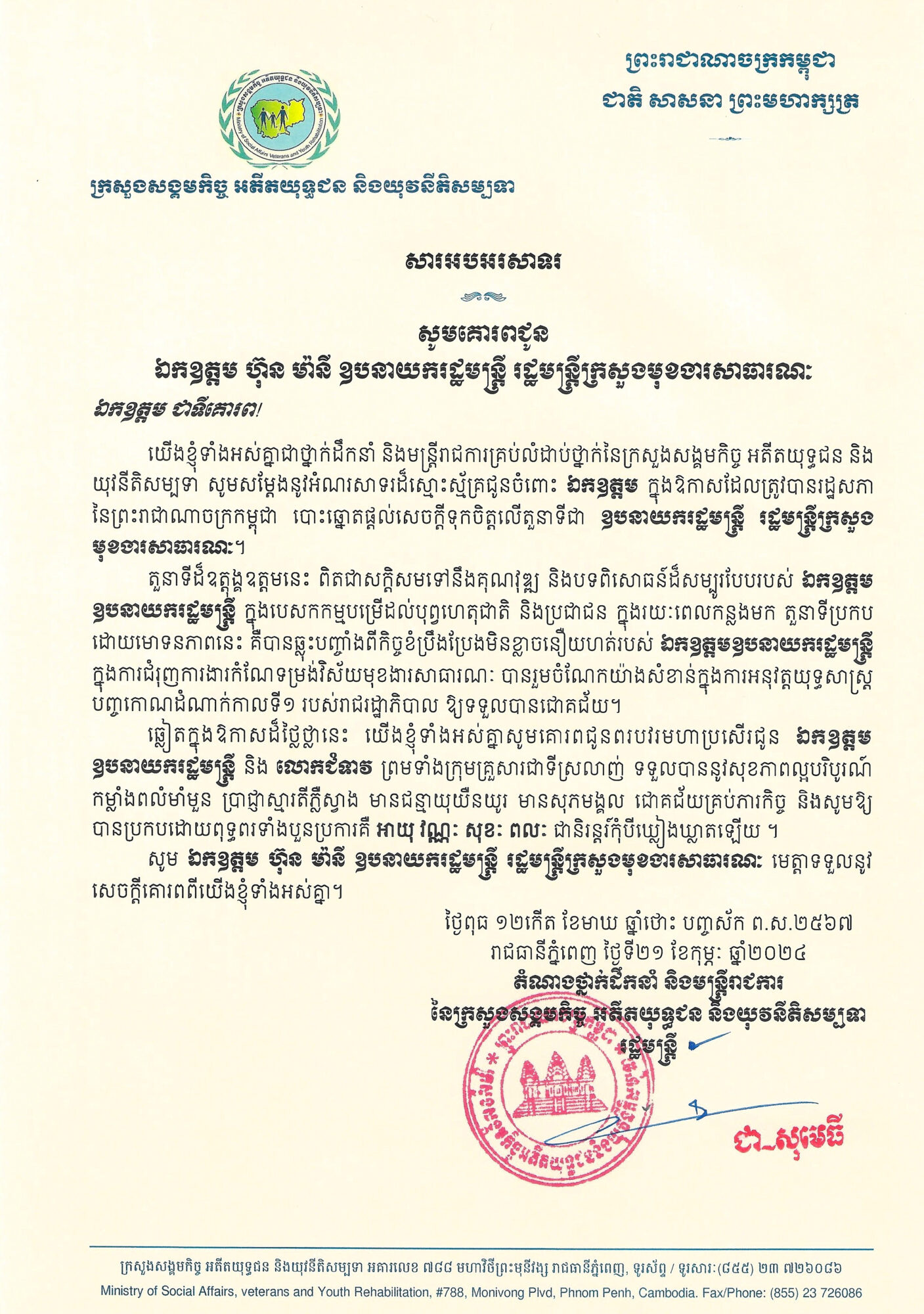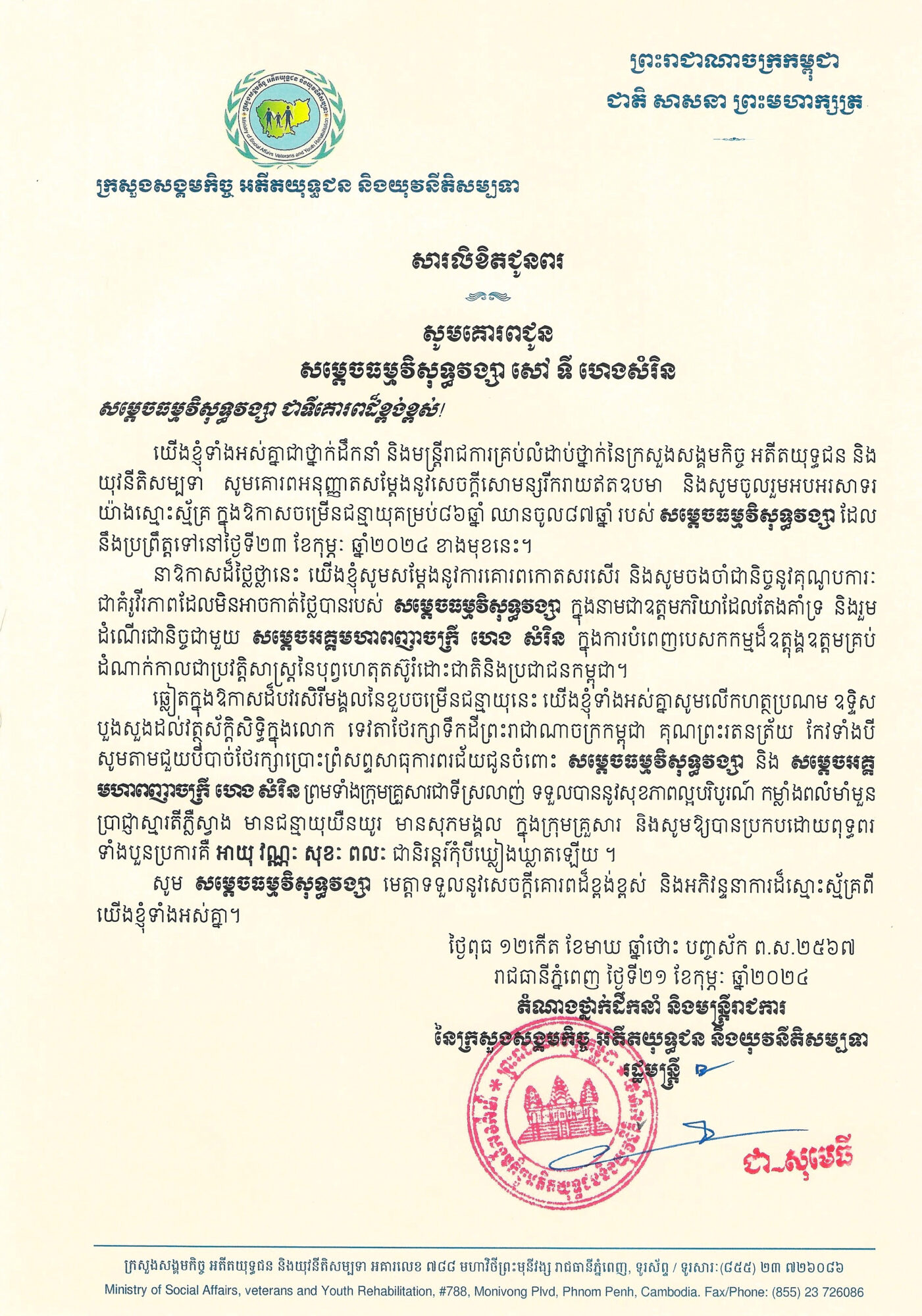 • ក្រសួងសង្គមកិច្ច អតីតយុទ្ធជន និងយុវនីតិសម្បទា សូមចូលរួមអបអរសាទរ ក្នុងឱកាសចម្រើនជន្មាយុគម្រប់៨៦ឆ្នាំ ឈានចូល៨៧ឆ្នាំ របស់ សម្ដេចធម្មវិសុទ្ធវង្សា សៅ ទី ហេងសំរិន