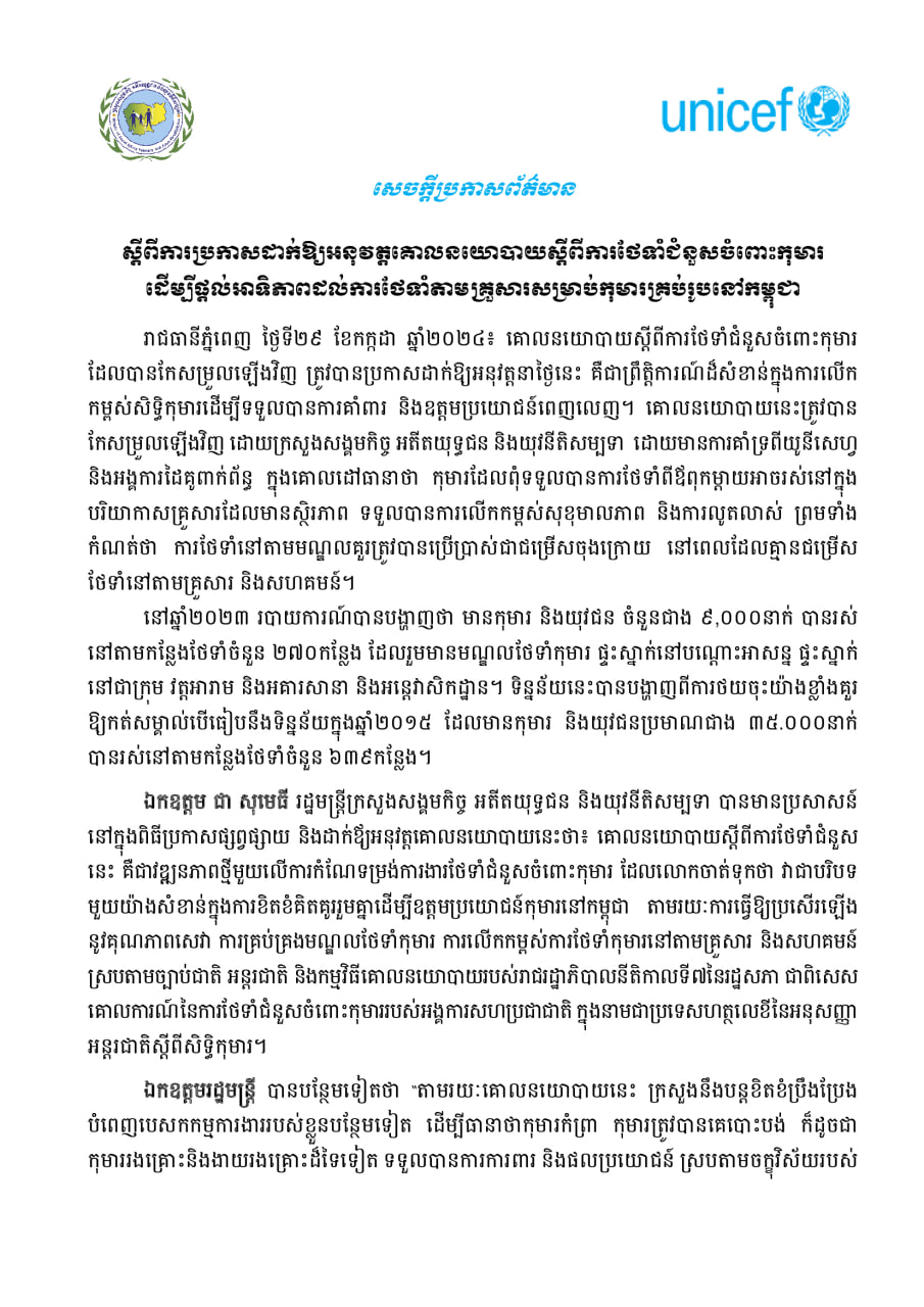 • ក្រសួងសង្គមកិច្ច អតីតយុទ្ធជន និងយុវនីតិសម្បទា បានចេញសេចក្តីប្រកាសព័ត៌មាន ស្តីពីការប្រកាសដាក់ឱ្យអនុវត្តគោលនយោបាយស្តីពីការថែទាំជំនួសចំពោះកុមារ