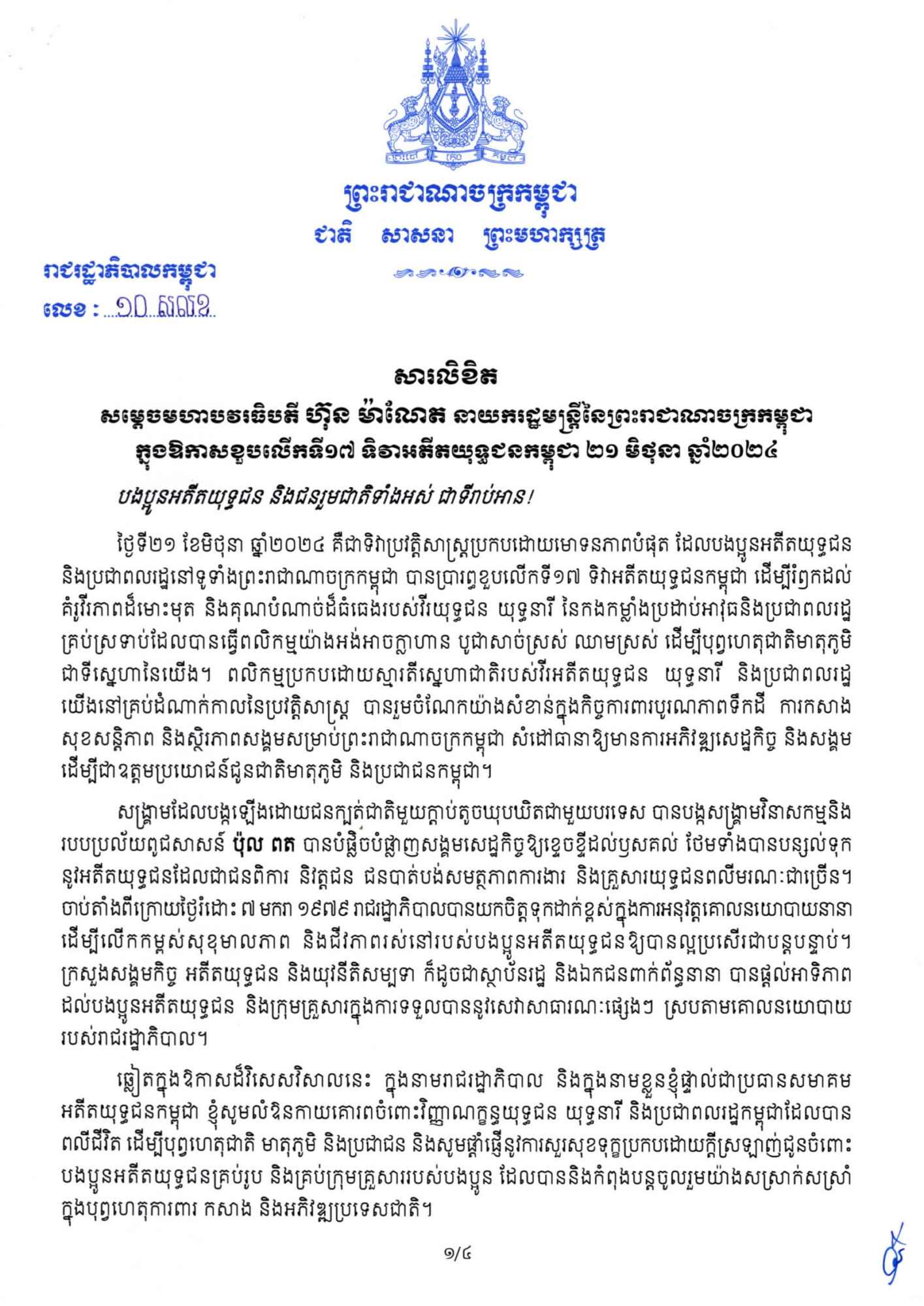 • សារលិខិត សម្ដេចមហាបវរធិបតី ហ៊ុន ម៉ាណែត នាយករដ្ឋមន្រ្តីនៃព្រះរាជាណាចក្រកម្ពុជា ក្នុងឱកាសខួបលើកទី១៧ ទិវាអតីតយុទ្ធជនកម្ពុជា ២១ មិថុនា ឆ្នាំ២០២៤សារលិខិត សម្ដេចមហាបវរធិបតី ហ៊ុន ម៉ាណែត នាយករដ្ឋមន្រ្តីនៃព្រះរាជាណាចក្រកម្ពុជា ក្នុងឱកាសខួបលើកទី១៧ ទិវាអតីតយុទ្ធជនកម្ពុជា ២១ មិថុនា ឆ្នាំ២០២៤