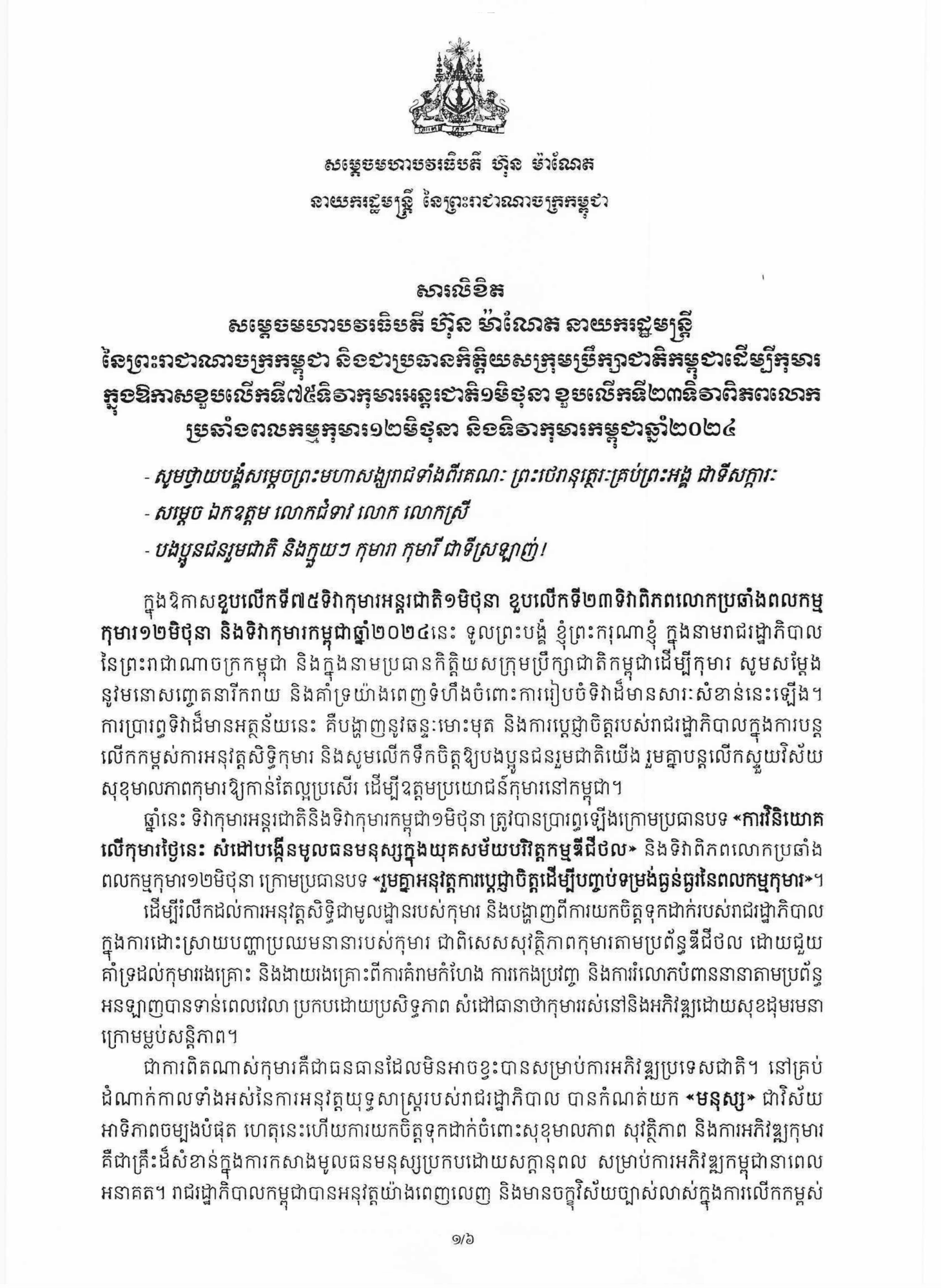• សារលិខិត សម្ដេចមហាបវរធិបតី ហ៊ុន ម៉ាណែត នាយករដ្ឋមន្រ្តីនៃព្រះរាជាណាចក្រកម្ពុជា និងជាប្រធានកិត្តិយសក្រុមប្រឹក្សាជាតិកម្ពុជាដើម្បីកុមារ ក្នុងឱកាសខួបលើកទី៧៥ទិវាកុមារអន្តរជាតិ១មិថុនា ខួបលើកទី២៣ទិវាពិភពលោកប្រឆាំងពលកម្មកុមារ១២មិថុនា និងទិវាកុមារកម្ពុជា២០២៤