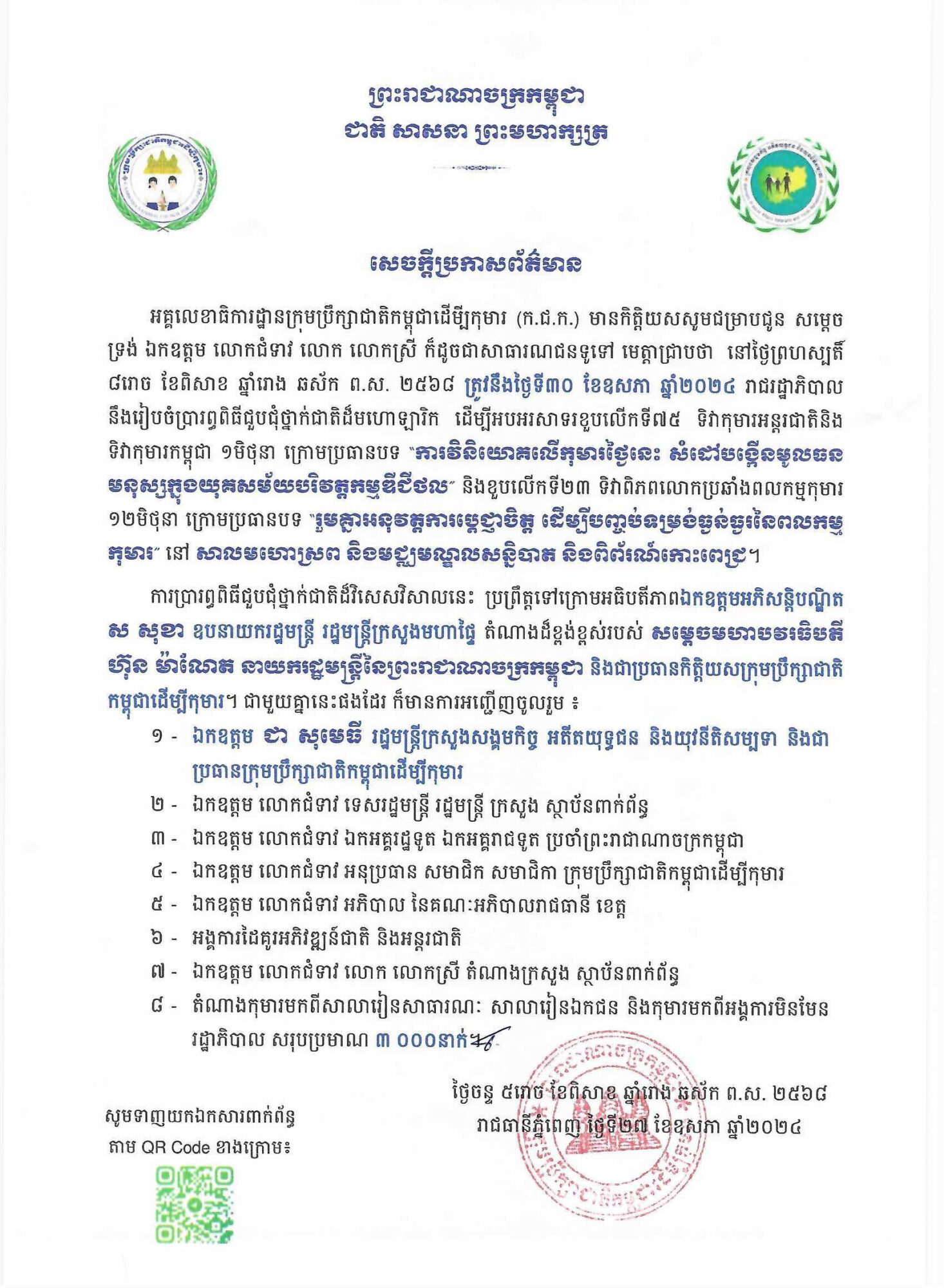 • សេចក្ដីប្រកាសព័ត៌មានរបស់ អគ្គលេខាធិការដ្ឋានក្រុមប្រឹក្សាជាតិកម្ពុជាដើម្បីកុមារ ស្ដីពីការរៀបចំពិធីជួបជុំថ្នាក់ជាតិដ៏មហោឡារិក ដើម្បីអបអរសាទរខួបលើកទី៧៥ទិវាកុមារអន្តរជាតិ និងទិវាកុមារកម្ពុជា ១មិថុនា និងខួបលើកទី២៣ទិវាពិភពលោកប្រឆាំងពលកម្មកុមារ ១២មិថុនា