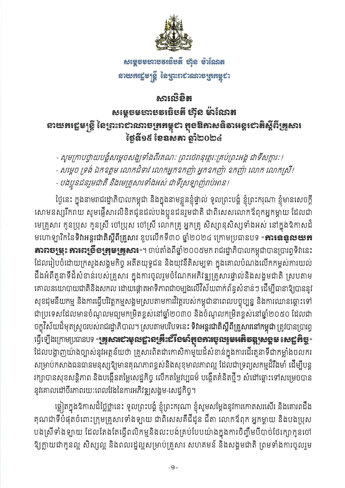 • សារលិខិត សម្ដេចមហាបវរធិបតី ហ៊ុន ម៉ាណែត នាយករដ្ឋមន្រ្តី នៃព្រះរាជាណាចក្រកម្ពុជា ក្នុងឱកាសទិវាអន្តរជាតិស្ដីពីគ្រួសារ ថ្ងៃទី១៥ ខែឧសភា ឆ្នាំ២០២៤។