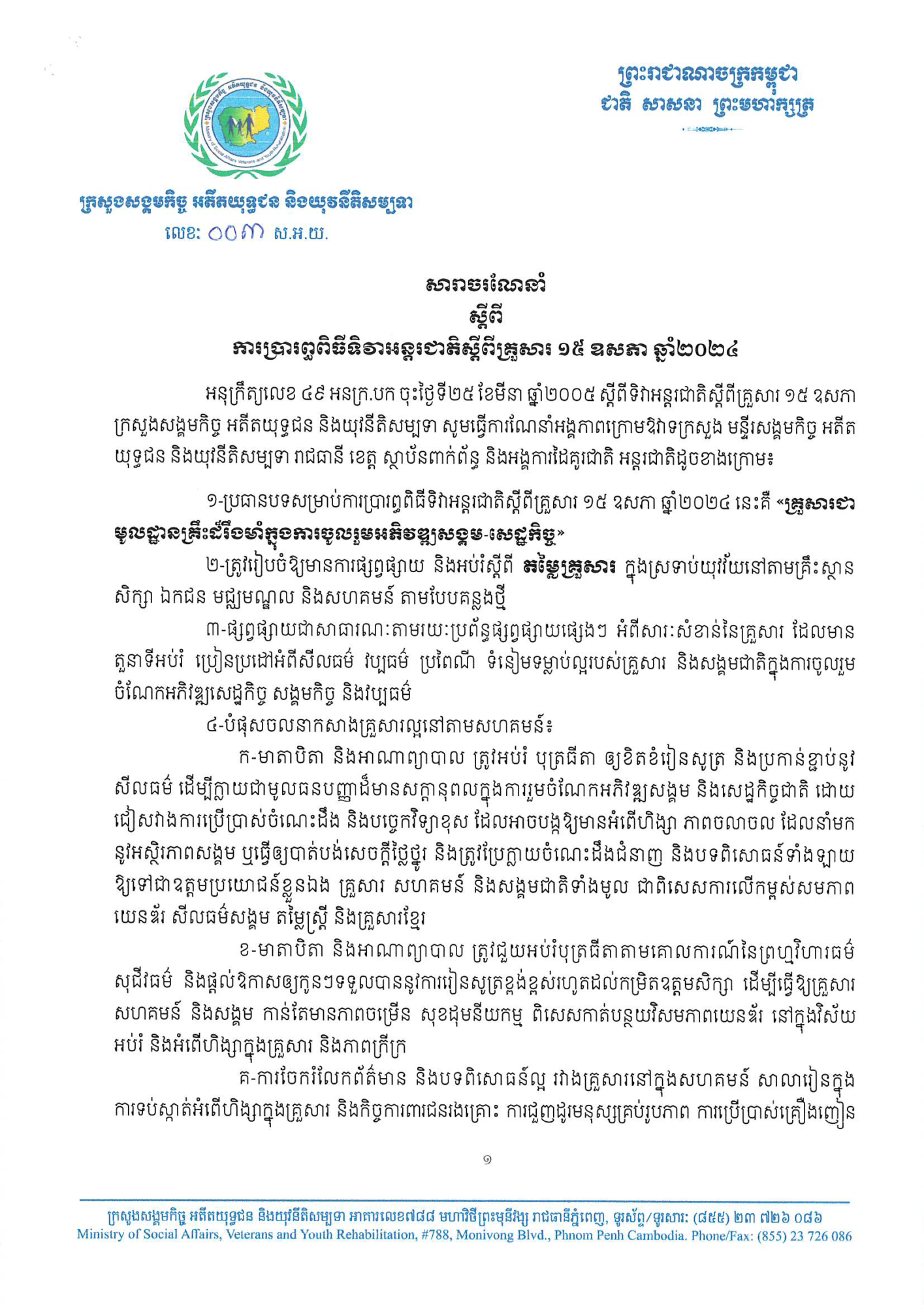 • សារាចរណែនាំរបស់ ក្រសួងសង្គមកិច្ច អតីតយុទ្ធជន និងយុវនីតិសម្បទា ស្ដីពីការប្រារព្ធពិធីទិវាអន្តរជាតិស្ដីពីគ្រួសារ ថ្ងៃទី១៥ ខែឧសភា ឆ្នាំ២០២៤