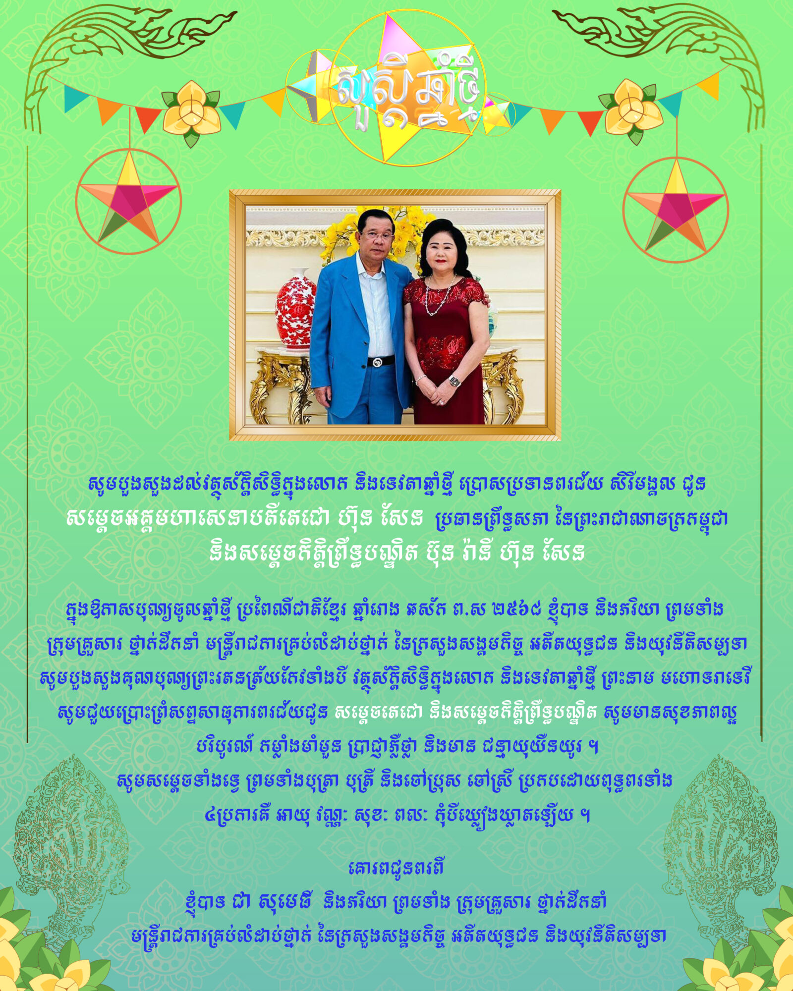• ឯកឧត្តមរដ្ឋមន្ត្រី ជា សុមេធី ផ្ញើរសារលិខិតជូនពរ សូមគោរពជូន សម្ដេចអគ្គមហាសេនាបតីតេជោ ហ៊ុន សែន ប្រធានព្រឹទ្ធសភា នៃព្រះរាជាណាចក្រកម្ពុជា និងសម្តេចកិត្តិព្រឹទ្ធបណ្ឌិត ប៊ុន រ៉ានី ហ៊ុន សែន ជាទីគោរពដ៏ខ្ពង់ខ្ពស់បំផុត ក្នុងឱកាសចូលឆ្នាំថ្មី ប្រពៃណីជាតិខ្មែរ ឆ្នាំរោង ឆស័ក ព.ស ២៥៦៨ ត្រូវនឹងថ្ងៃទី១៣ ខែមេសា ឆ្នាំ២០២៤ ខាងមុខនេះ។