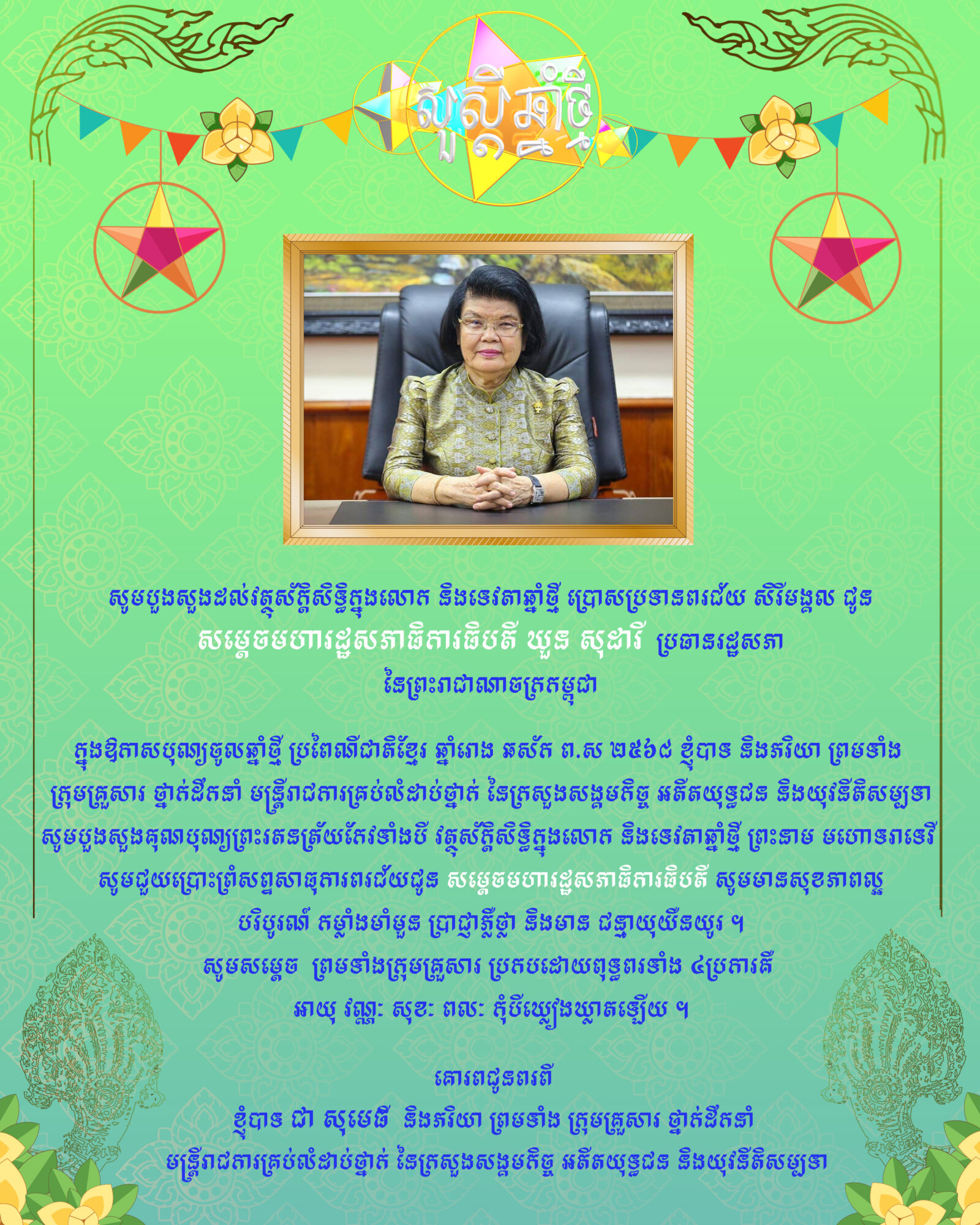 • ឯកឧត្តមរដ្ឋមន្ត្រី ជា សុមេធី ផ្ញើរសារលិខិតជូនពរ សូមគោរពជូន សម្ដេចមហារដ្ឋសភាធិការធិបតី ឃួន សុដារី ប្រធានរដ្ឋសភា នៃព្រះរាជាណាចក្រកម្ពុជា ជាទីគោរពដ៏ខ្ពង់ខ្ពស់បំផុត ក្នុងឱកាសចូលឆ្នាំថ្មី ប្រពៃណីជាតិខ្មែរ ឆ្នាំរោង ឆស័ក ព.ស ២៥៦៨ ត្រូវនឹងថ្ងៃទី១៣ ខែមេសា ឆ្នាំ២០២៤ ខាងមុខនេះ។