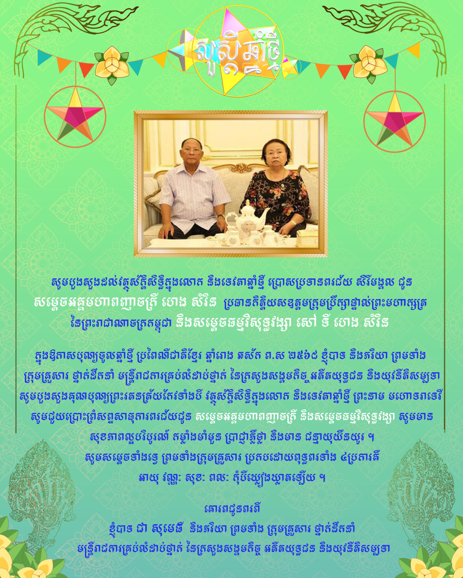 • ឯកឧត្តមរដ្ឋមន្ត្រី ជា សុមេធី ផ្ញើរសារលិខិតជូនពរ សូមគោរពជូន សម្ដេចអគ្គមហាពញាចក្រី កិត្តិព្រឹទ្ធបណ្ឌិត ហេង សំរិន ប្រធានកិត្តិយសក្រុមឧត្តមប្រឹក្សាផ្ទាល់ព្រះមហាក្សត្រ នៃព្រះរាជាណាចក្រកម្ពុជា និងសម្តេចធម្មវិសុទ្ធវស្សា សៅ ទី ហេង សំរិន ជាទីគោរពដ៏ខ្ពង់ខ្ពស់បំផុត ក្នុងឱកាសចូលឆ្នាំថ្មី ប្រពៃណីជាតិខ្មែរ ឆ្នាំរោង ឆស័ក ព.ស ២៥៦៨ ត្រូវនឹងថ្ងៃទី១៣ ខែមេសា ឆ្នាំ២០២៤ ខាងមុខនេះ។