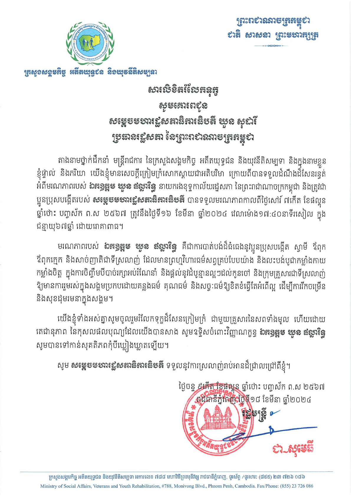 • ឯកឧត្តមរដ្ឋមន្រ្តី ជា សុមេធី ៖ សូមចូលរួមរំលែកទុក្ខជូនចំពោះសម្ដេចមហារដ្ឋសភាធិការធិបតី ឃួន សុដារី ប្រធានរដ្ឋសភា ព្រមទាំងក្រុមគ្រួសារ ក្រោយពីបានទទួលដំណឹងដ៏សែនរន្ធត់អំពីមរណភាពរបស់ឯកឧត្ដម ឃួន ផល្លារិទ្ធ នាយករងខុទ្ទកាល័យ និងត្រូវជាប្អូនប្រុសបង្កើតរបស់សម្ដេចមហារដ្ឋសភាធិការធិបតីប្រធានរដ្ឋសភា ដែលបានទទួលអនិច្ចកម្មដោយរោគាពាធ នៅវេលាម៉ោង ៥:៤០នាទីល្ងាច ត្រូវនឹងថ្ងៃទី១៦ ខែមីនា ឆ្នាំ២០២៤ ក្នុងជន្មាយុ ៦៧ឆ្នាំ ស្ថិតនៅគេហដ្ឋានក្នុងសង្កាត់ព្រែកលាភ ខណ្ឌជ្រោយចង្វា រាជធានីភ្នំពេញ។