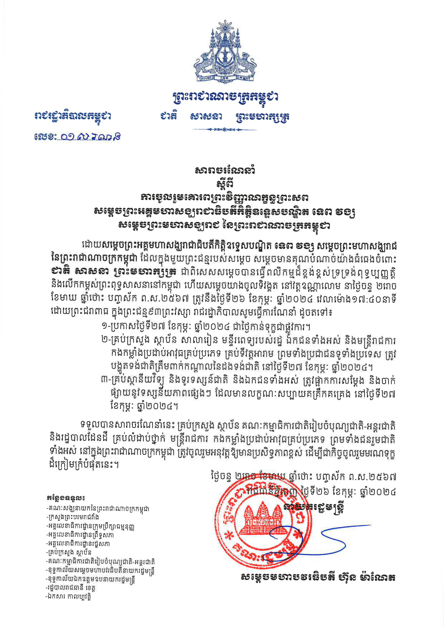 • សារាចរណែនាំស្តីពីការចូលរួមគោរពព្រះវិញ្ញាណក្ខន្ធព្រះសព សម្តេចព្រះអគ្គមហាសង្ឃរាជាធិបតីកិត្តិឧទ្ទេសបណ្ឌិត ទេព វង្ស សម្តេចព្រះមហាសង្ឃរាជ នៃព្រះរាជាណាចក្រកម្ពុជា
