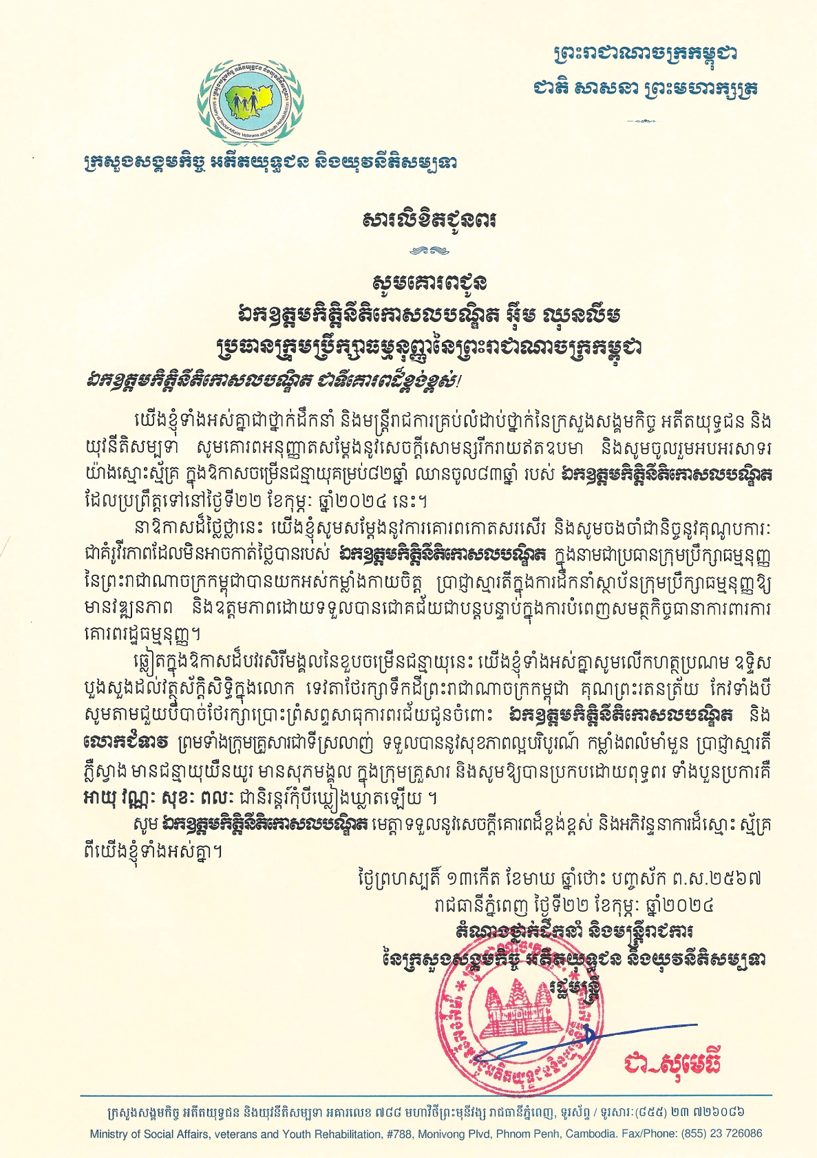 • ឯកឧត្តមរដ្ឋមន្ត្រី ជា សុមេធី និងលោកជំទាវ ជា ផល្គុន ព្រមទាំង ថ្នាក់ដឹកនាំ និងមន្ត្រីរាជការគ្រប់លំដាប់ថ្នាក់ នៃក្រសួងសង្គមកិច្ច អតីតយុទ្ធជន និងយុវនីតិសម្បទា សូមគោរពសម្ដែងនូវសេចក្ដីសោមនស្សរីករាយ ក្នុងឱកាសដ៏ឧត្តុងឧត្តមថ្លៃថ្លា នៃខួបចម្រើនជន្មាយុគម្រប់ ៨២ ឈានចូល ៨៣ឆ្នាំ របស់ឯកឧត្តមកិត្តិនីតិកោសលបណ្ឌិត អ៊ឹម ឈុនលឹង ប្រធានក្រុមប្រឹក្សាធម្មនុញ្ញ នៃព្រះរាជាណាចក្រកម្ពុជា ដែលប្រព្រឹត្តទៅនៅថ្ងៃទី២២ ខែកុម្ភ: ឆ្នាំ២០២៤ នេះ។